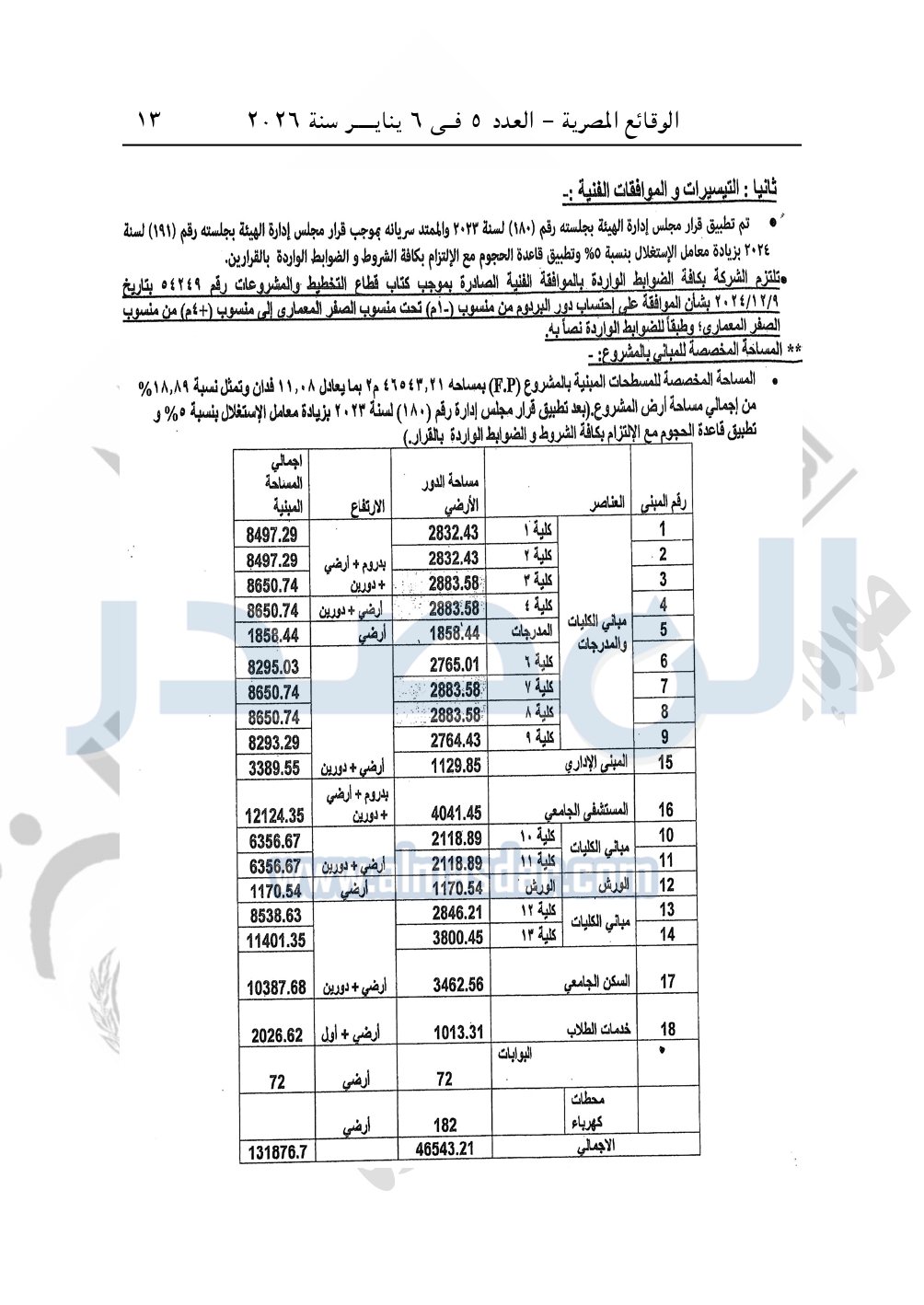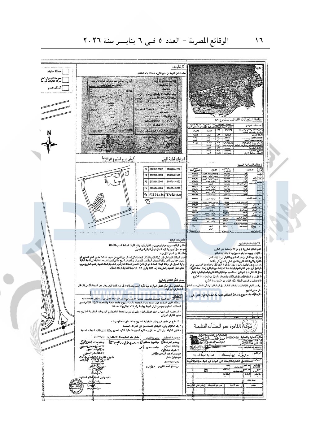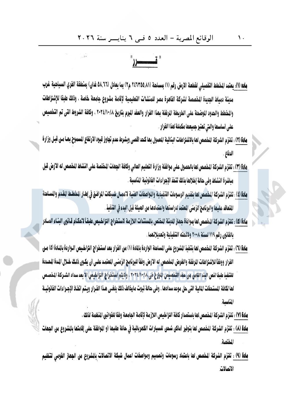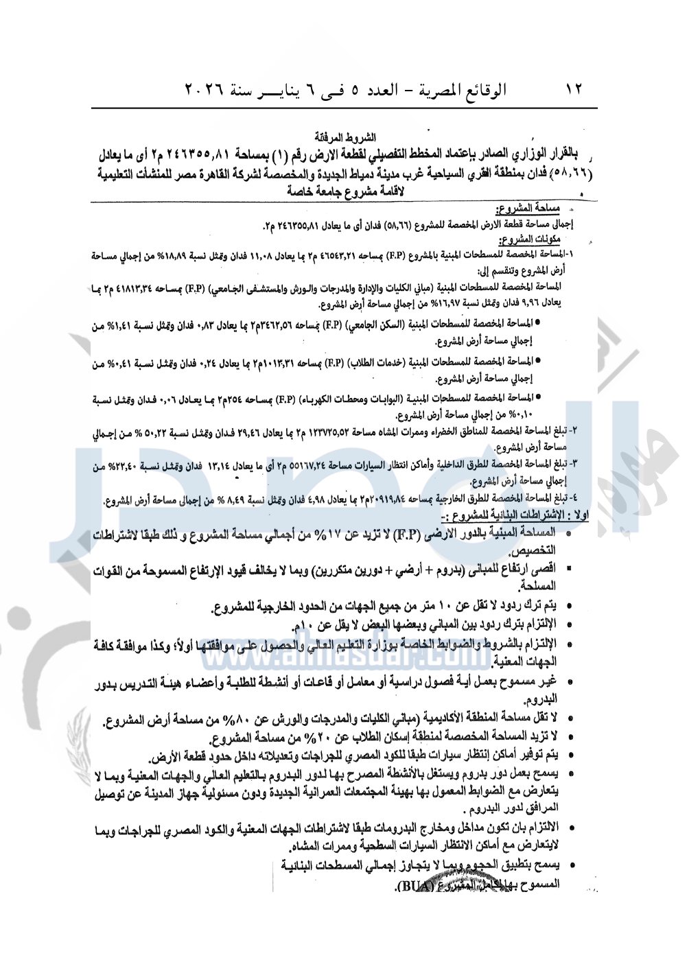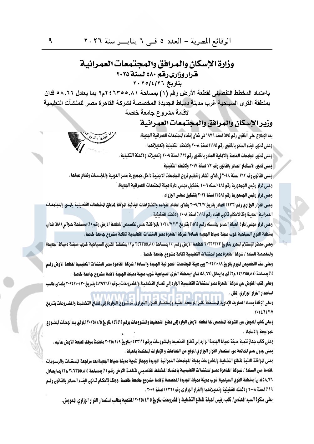 نشرت الوقائع المصرية في العدد 5، الصادر في 6 يناير 2026، قرار وزارة الإسكان والمرافق والمجتمعات العمرانية، رقم 480 لسنة 2025، بتاريخ 26-4-2025، بشأن اعتماد المخطط التفصيلى لقطعة الأرض رقم "1" بمساحة 246355.81م2 بما يعادل 58.66 فدان بمنطقة القرى السياحية غرب مدينة دمياط الجديدة المخصصة لشركة القاهرة مصر للمنشآت التعليمية لإقامة مشروع جامعة خاصة.