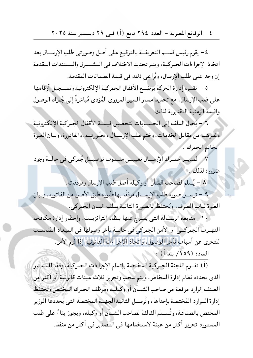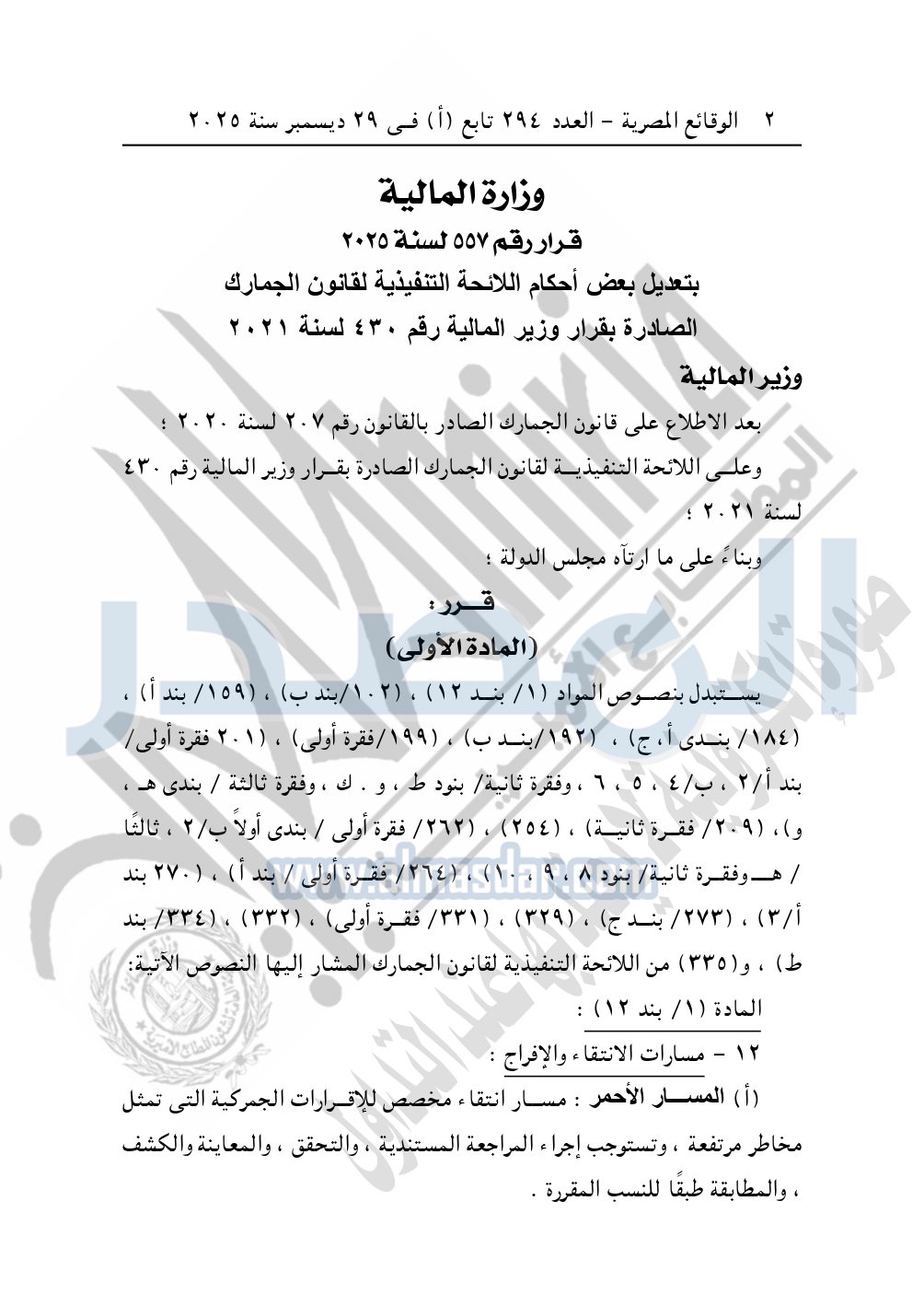 نشرت الوقائع المصرية، في العدد 294 تابع "أ"، الصادر في 29 ديسمبر سنة 2025، قرار وزارة المالية، رقم 557 لسنة 2025، بتعديل بعض أحكام اللائحة التنفيذية لقانون الجمارك الصادرة بقرار وزير المالية رقم 430 لسنة 2021.