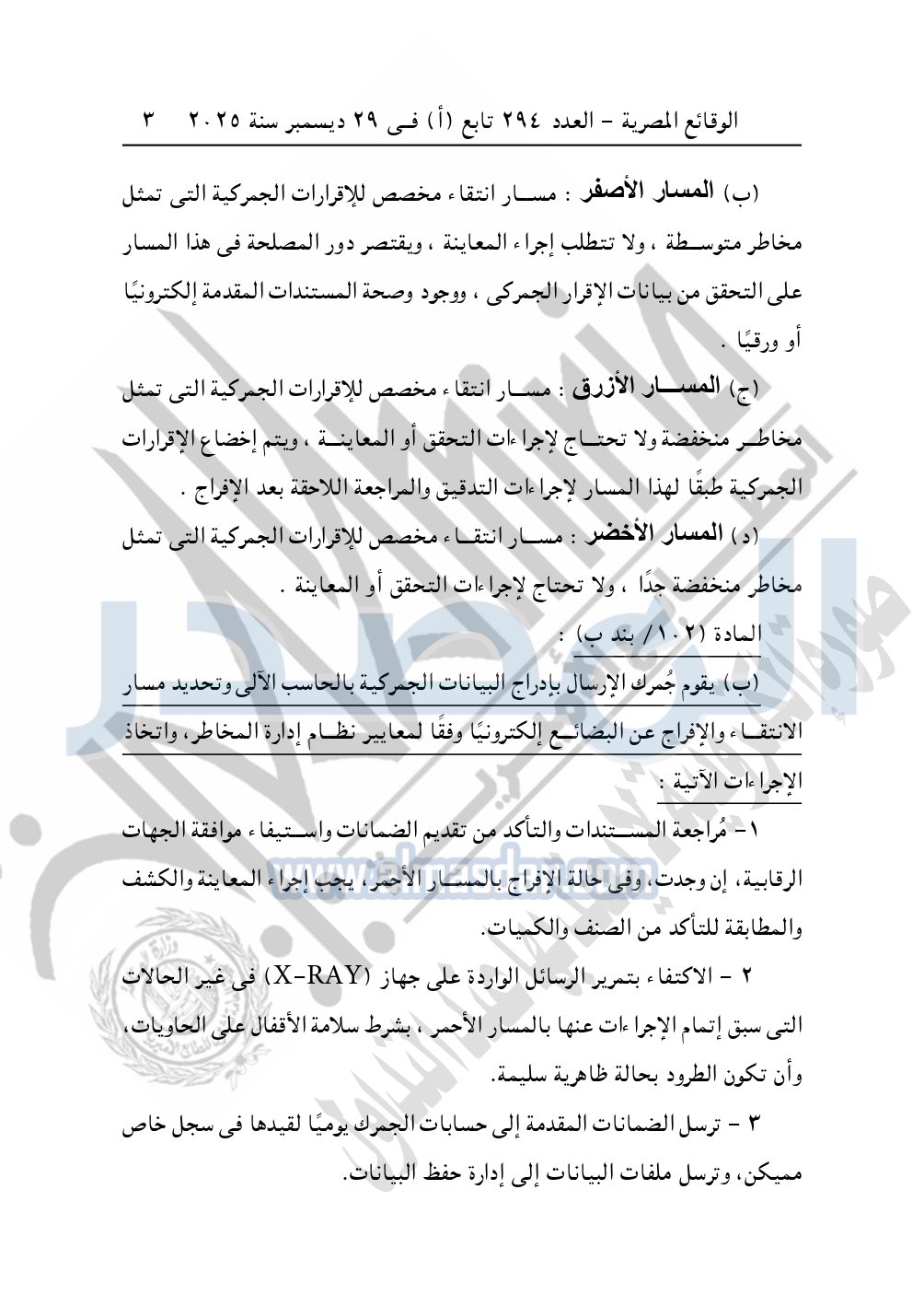 "أ" المسار الأحمر: مسار انتقاء مخصص للإقرارات الجمركية التي تمثل مخاطر مرتفعة، وتستوجب إجراء المراجعة المستندية، والتحقق، والمعاينة والكشف، والمطابقة طبقًا للنسب المقررة.