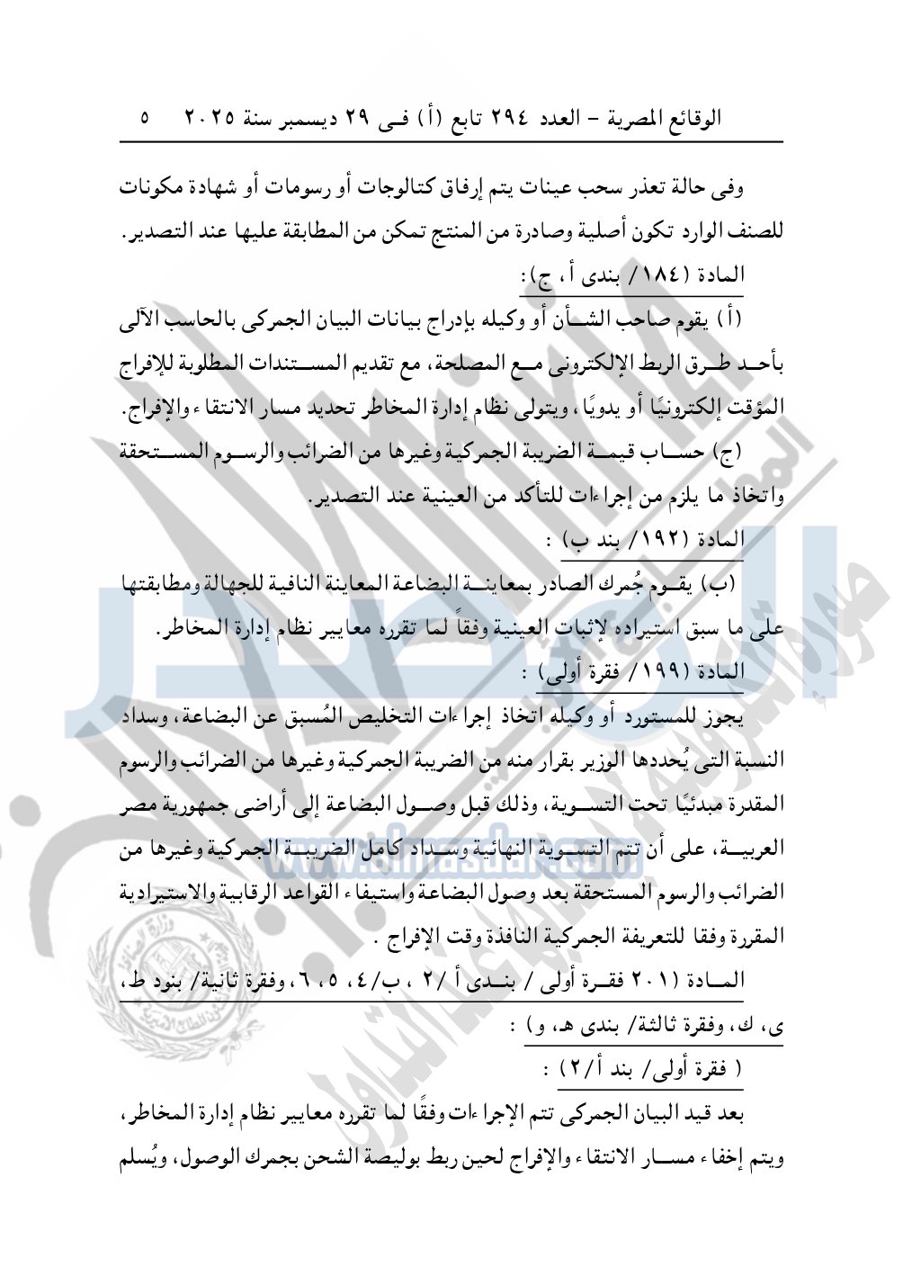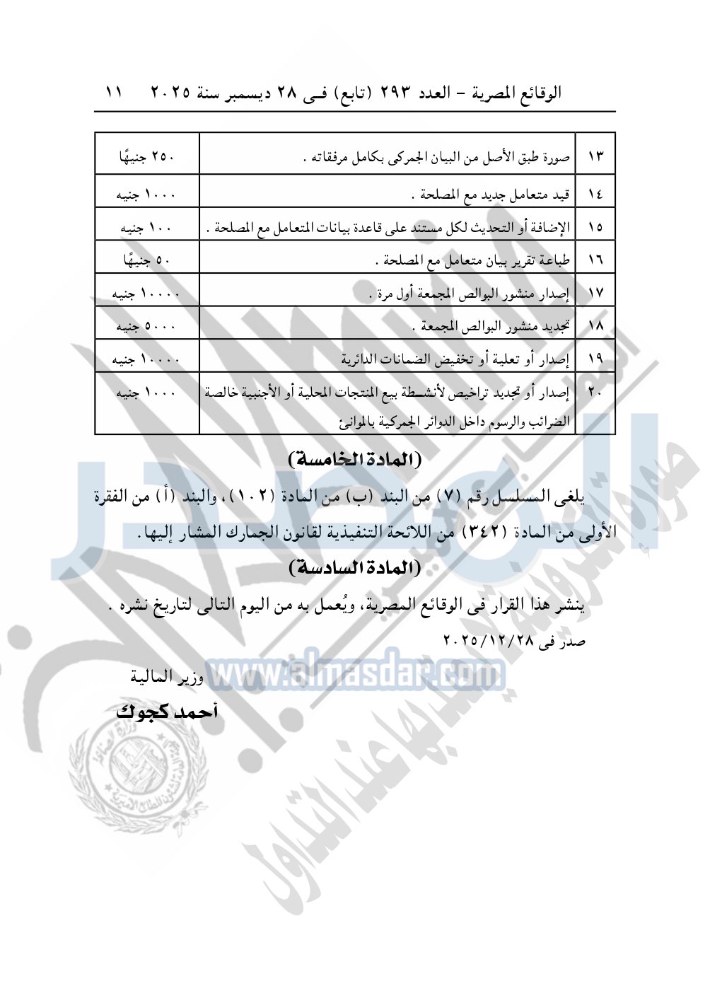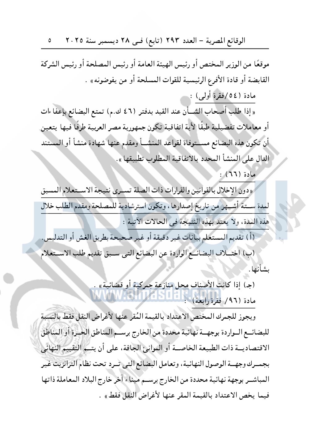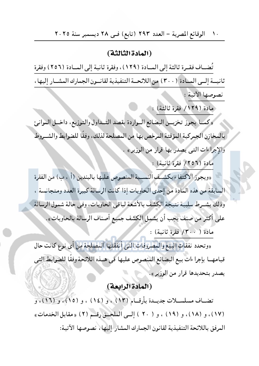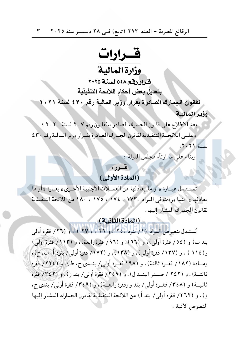 كما نشرت الوقائع المصرية، في العدد 293 "تابع"، الصادر في 28 ديسمبر سنة 2025، قرار وزارة المالية، رقم 548 لسنة 2025، بتعديل بعض أحكام اللائحة التنفيذية لقانون الجمارك الصادرة بقرار وزير المالية رقم 430 لسنة 2021.