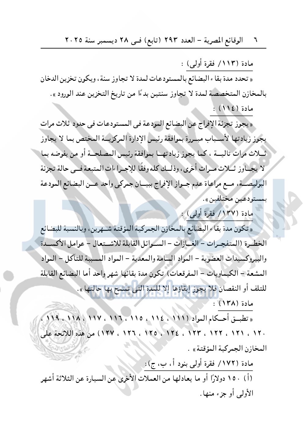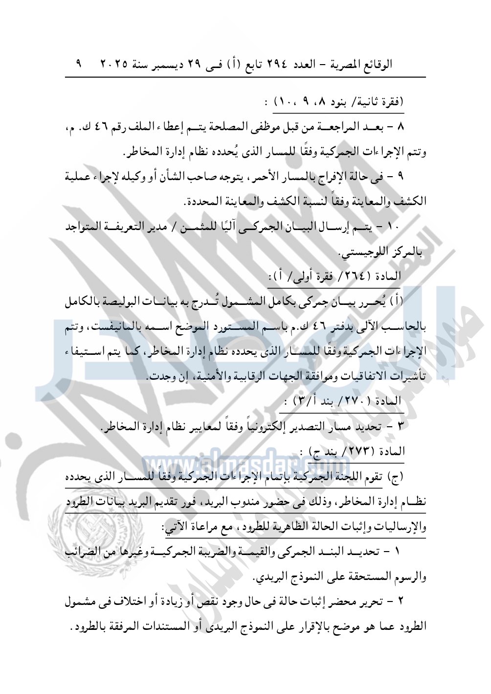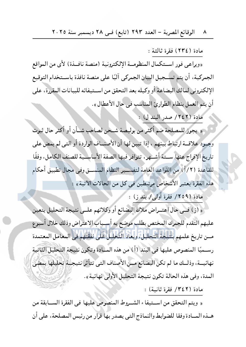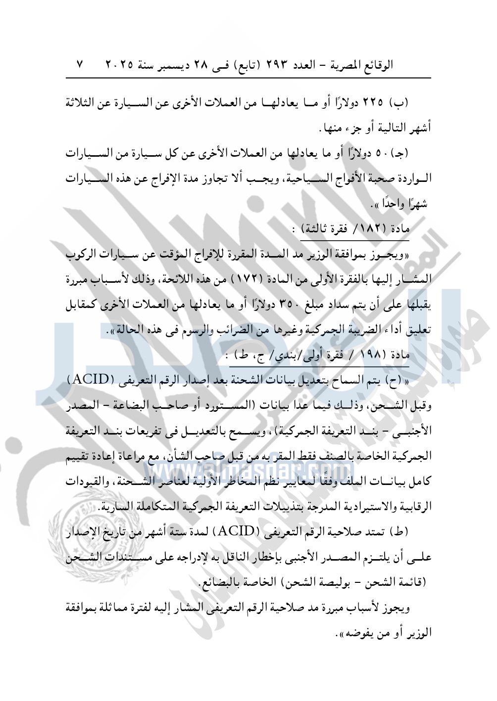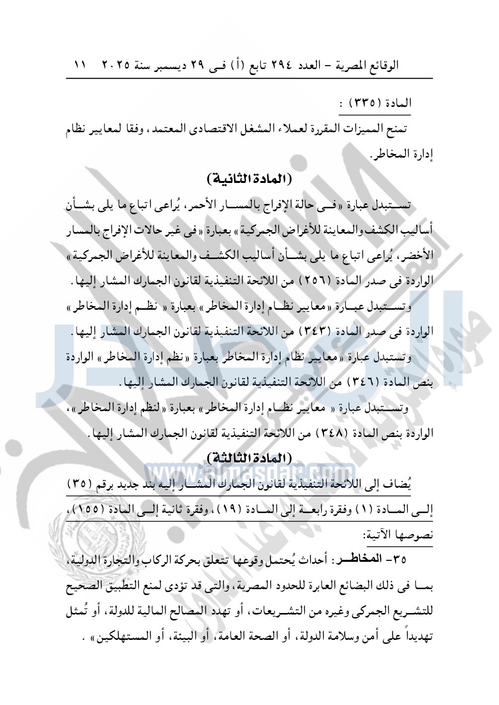كما نشرت الوقائع المصرية، في العدد 293 "تابع"، الصادر في 28 ديسمبر سنة 2025، قرار وزارة المالية، رقم 548 لسنة 2025، بتعديل بعض أحكام اللائحة التنفيذية لقانون الجمارك الصادرة بقرار وزير المالية رقم 430 لسنة 2021.