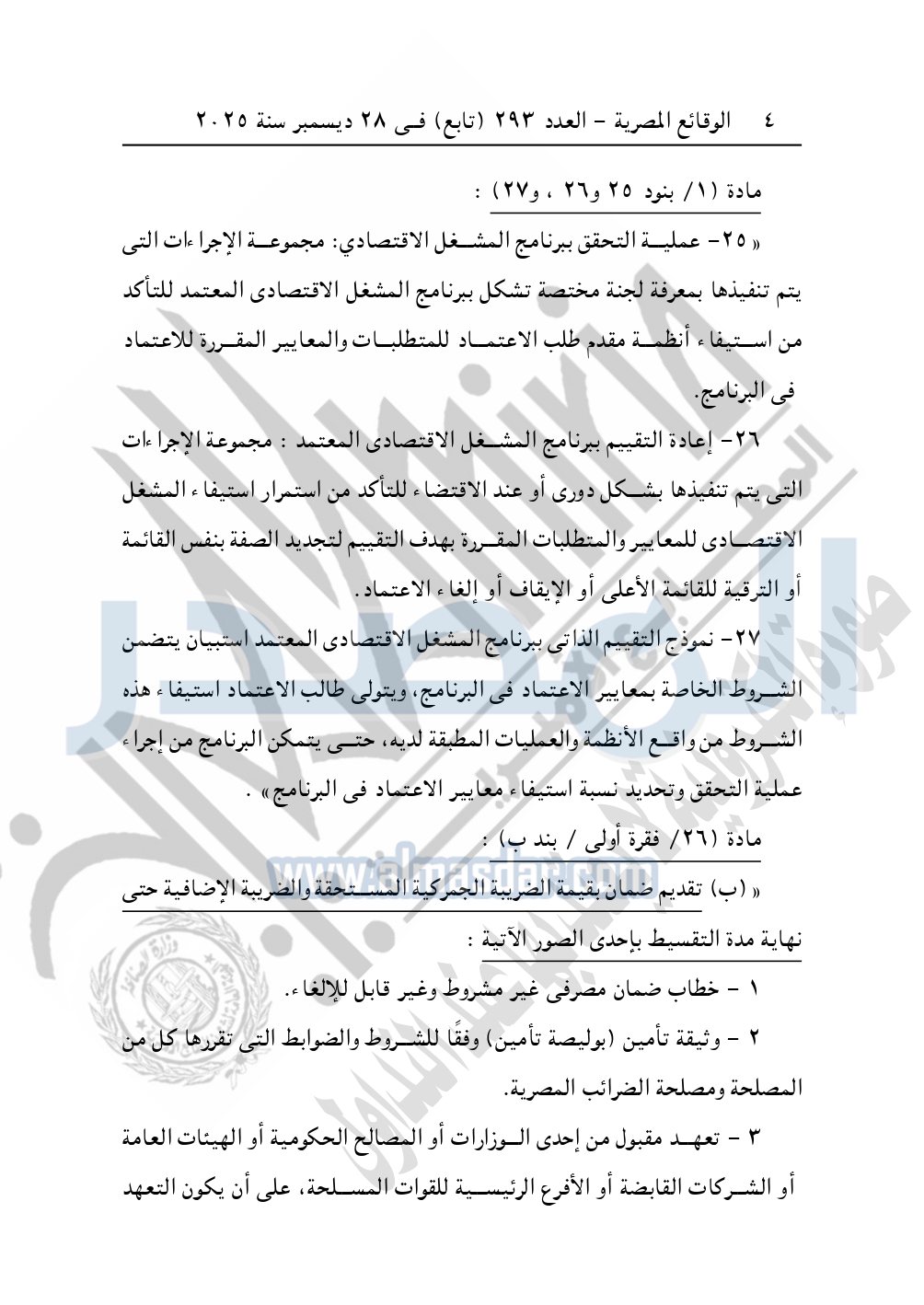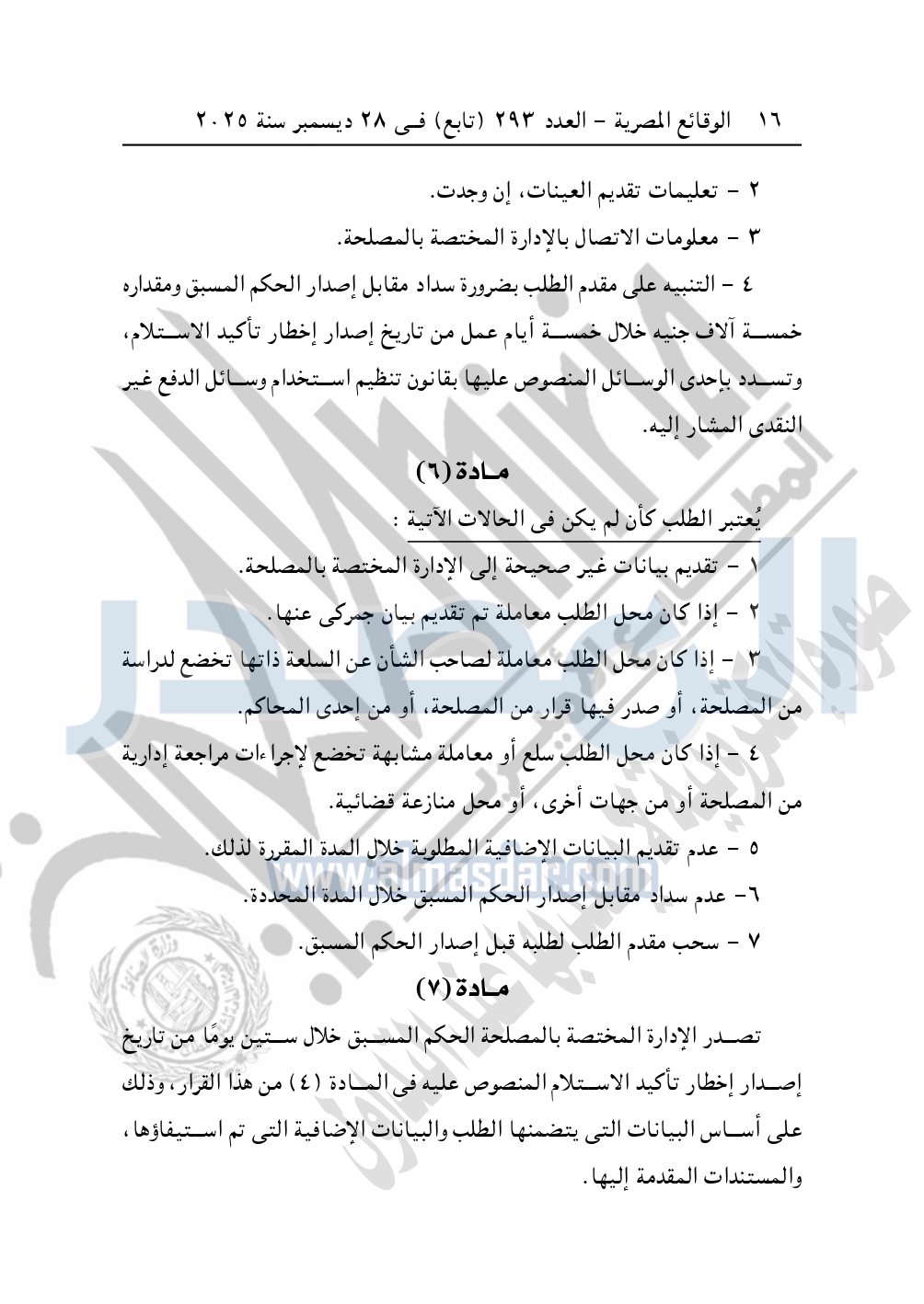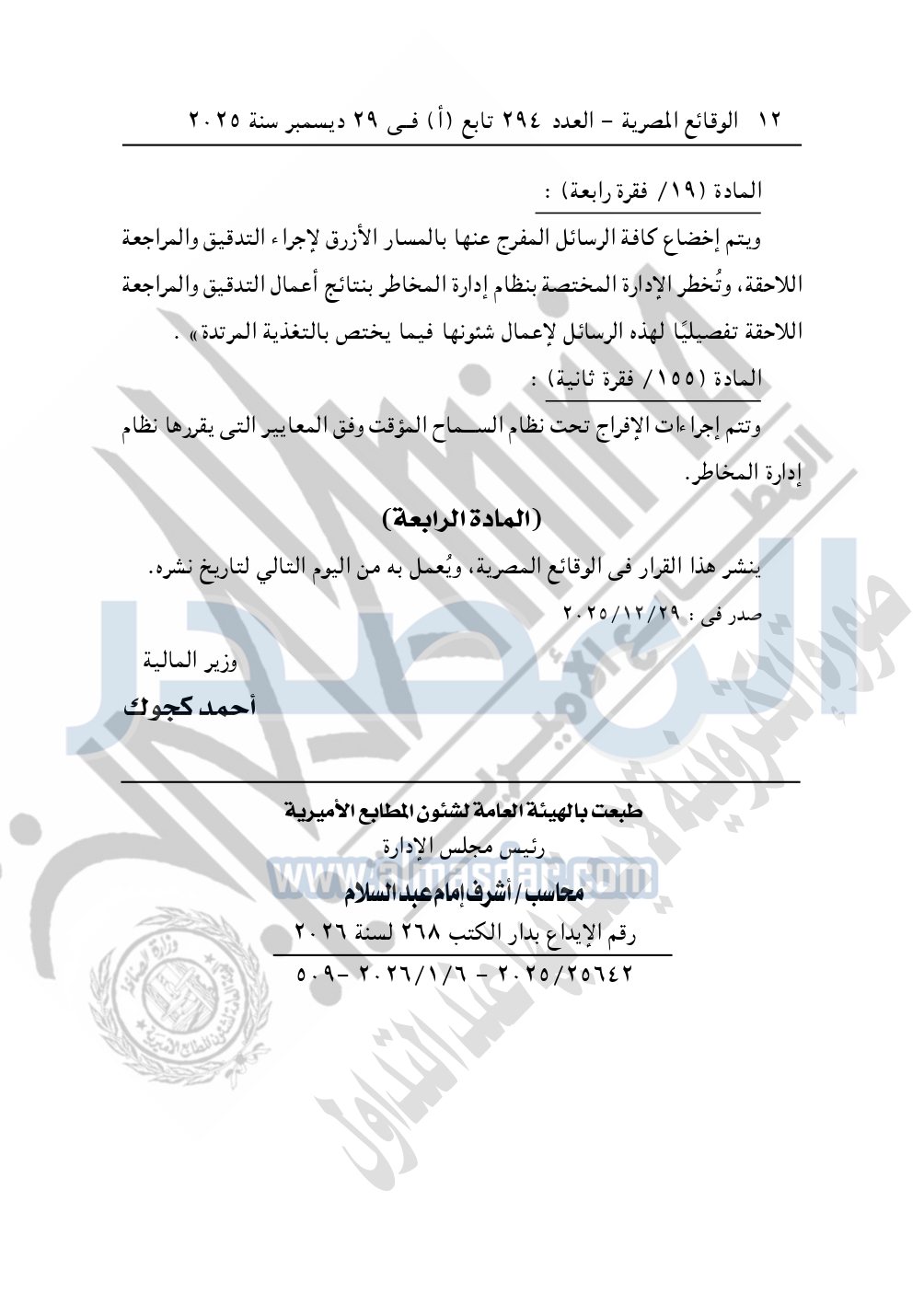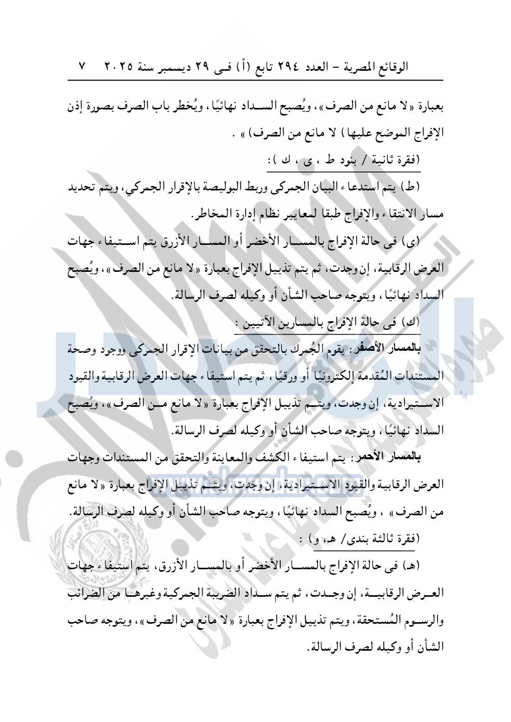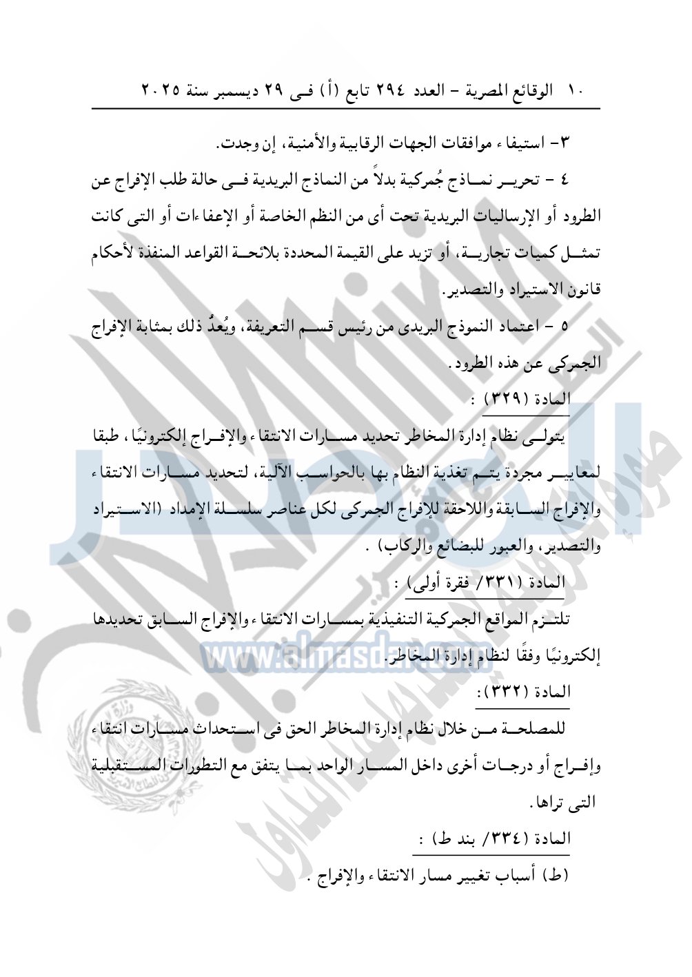 كما نشرت الوقائع المصرية، في العدد 293 "تابع"، الصادر في 28 ديسمبر سنة 2025، قرار وزارة المالية، رقم 548 لسنة 2025، بتعديل بعض أحكام اللائحة التنفيذية لقانون الجمارك الصادرة بقرار وزير المالية رقم 430 لسنة 2021.