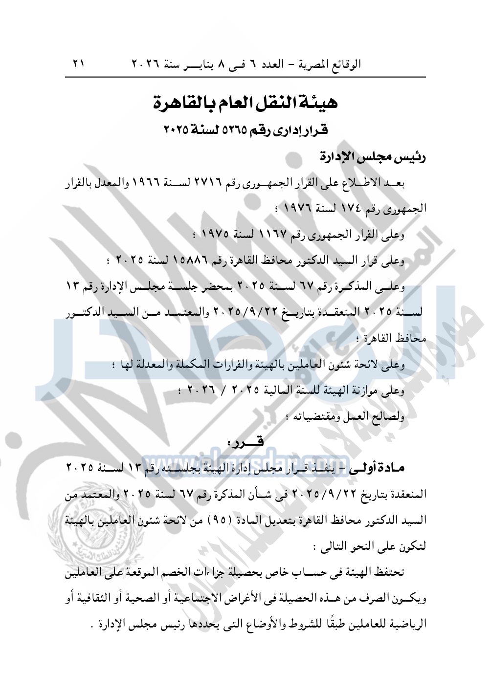 نشرت الوقائع المصرية، في العدد 6، الصادر في 8 يناير 2026، قرار هيئة النقل العام بالقاهرة، قرار رقم 5265 لسنة 2025، بشأن تعديل المادة "95" من لائحة شئون العاملين بالهيئة.