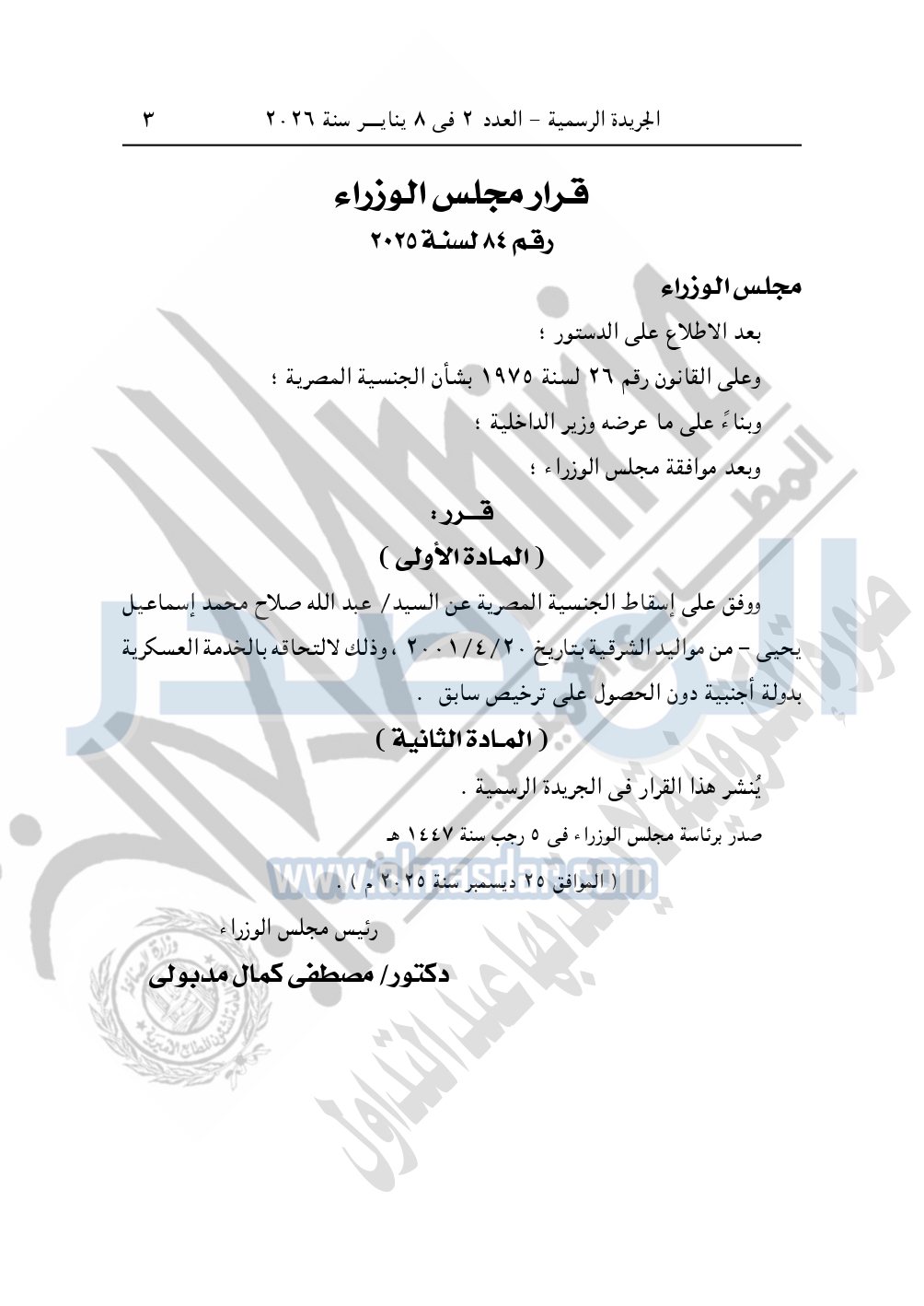 نشرت الوقائع المصرية في العدد 2، بتاريخ 8 يناير 2026، قرار قرار رئيس مجلس الوزراء، رقم 84 لسنة 2025، بشأن الموافقة على على إسقاط الجنسية المصرية عن عبد الله صلاح محمد إسماعيل يحيى.