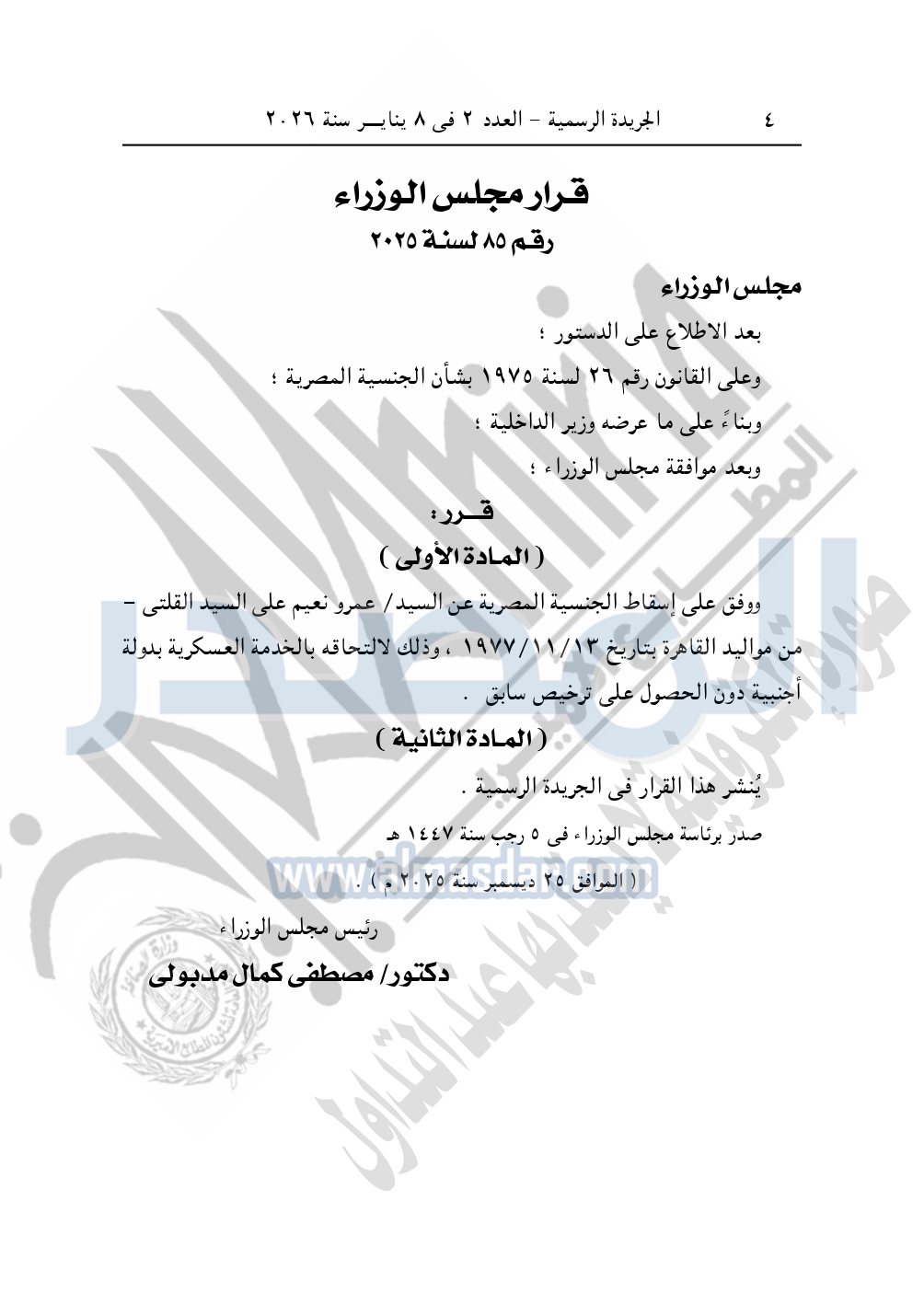 كما نشرت الوقائع المصرية في العدد 2، بتاريخ 8 يناير 2026، قرار قرار رئيس مجلس الوزراء، رقم 85 لسنة 2025، بشأن الموافقة على على إسقاط الجنسية المصرية عن عمرو نعيم على السيد القلتي.