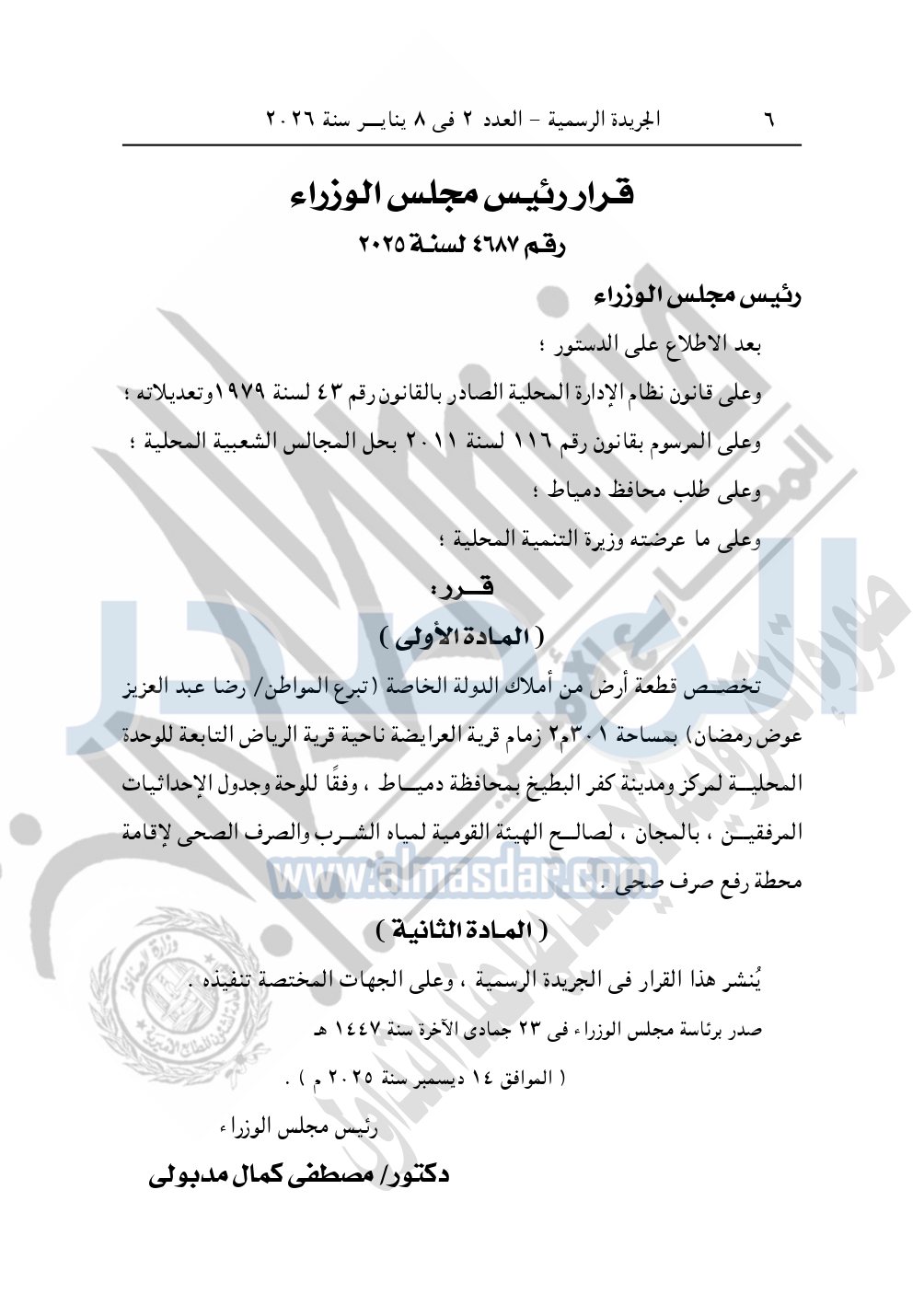 نشرت الجريدة الرسمية، في العدد 2، الصادر في 8 يناير 2026، قرار رئيس مجلس الوزراء، رقم 4687 لسنة 2025، بشأن تخصيص قطعة أرض لإقامة محطة رفع صرف صحى بمحافظة دمياط.