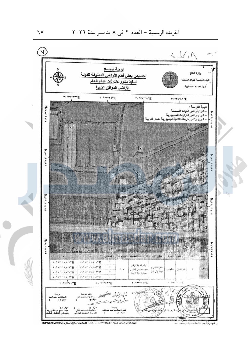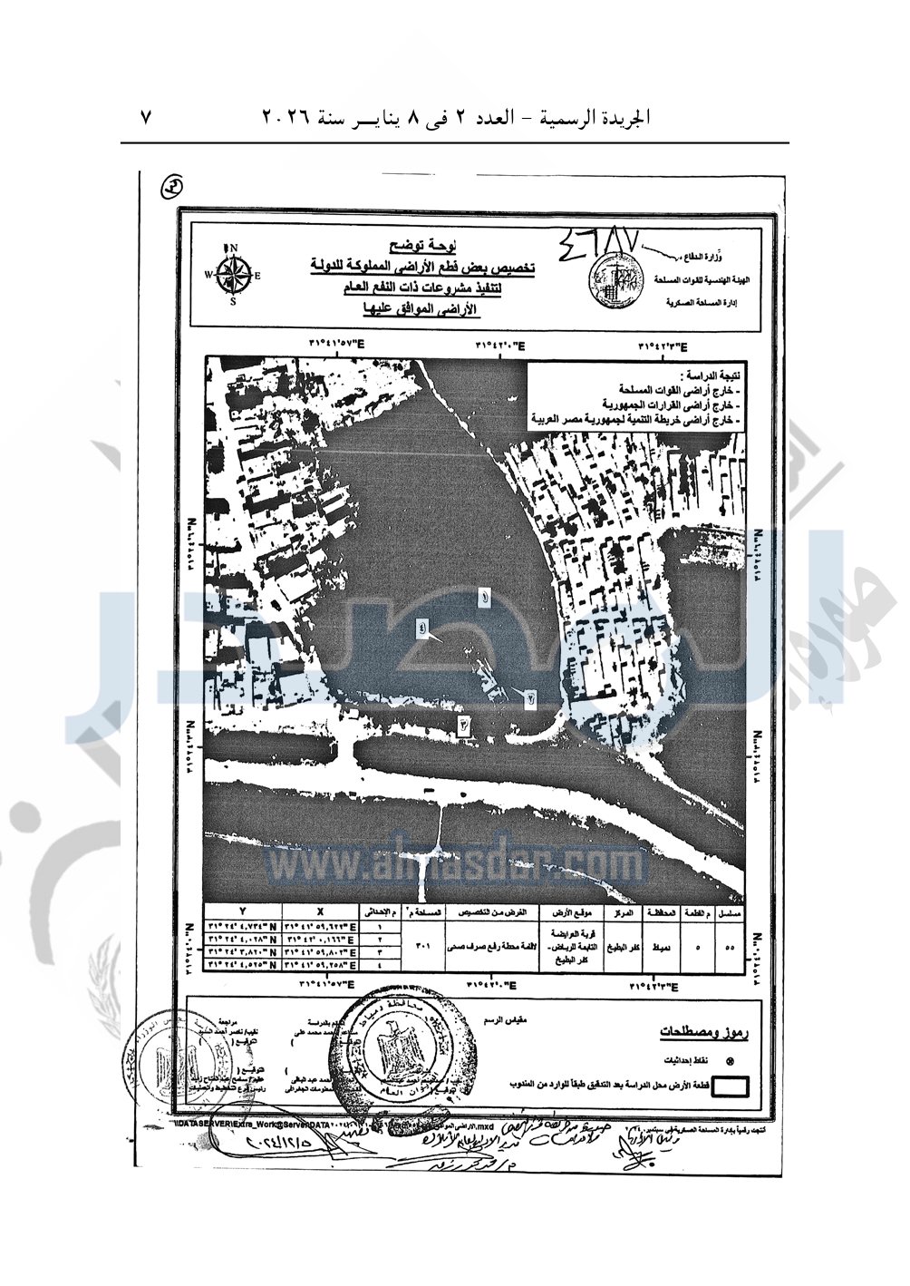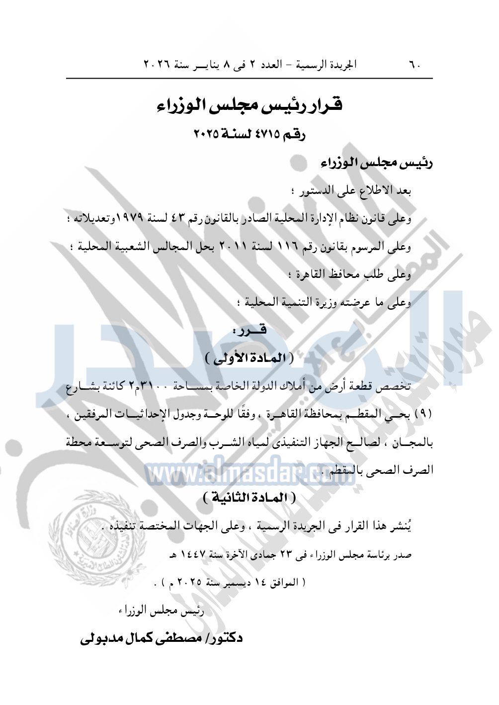 كما نشرت الجريدة الرسمية، في العدد 2، الصادر في 8 يناير 2026، قرار رئيس مجلس الوزراء، رقم 4715 لسنة 2025، بشأن تخصيص قطعة أرض لتوسعة محطة رفع صرف صحى بمحافظة القاهرة.