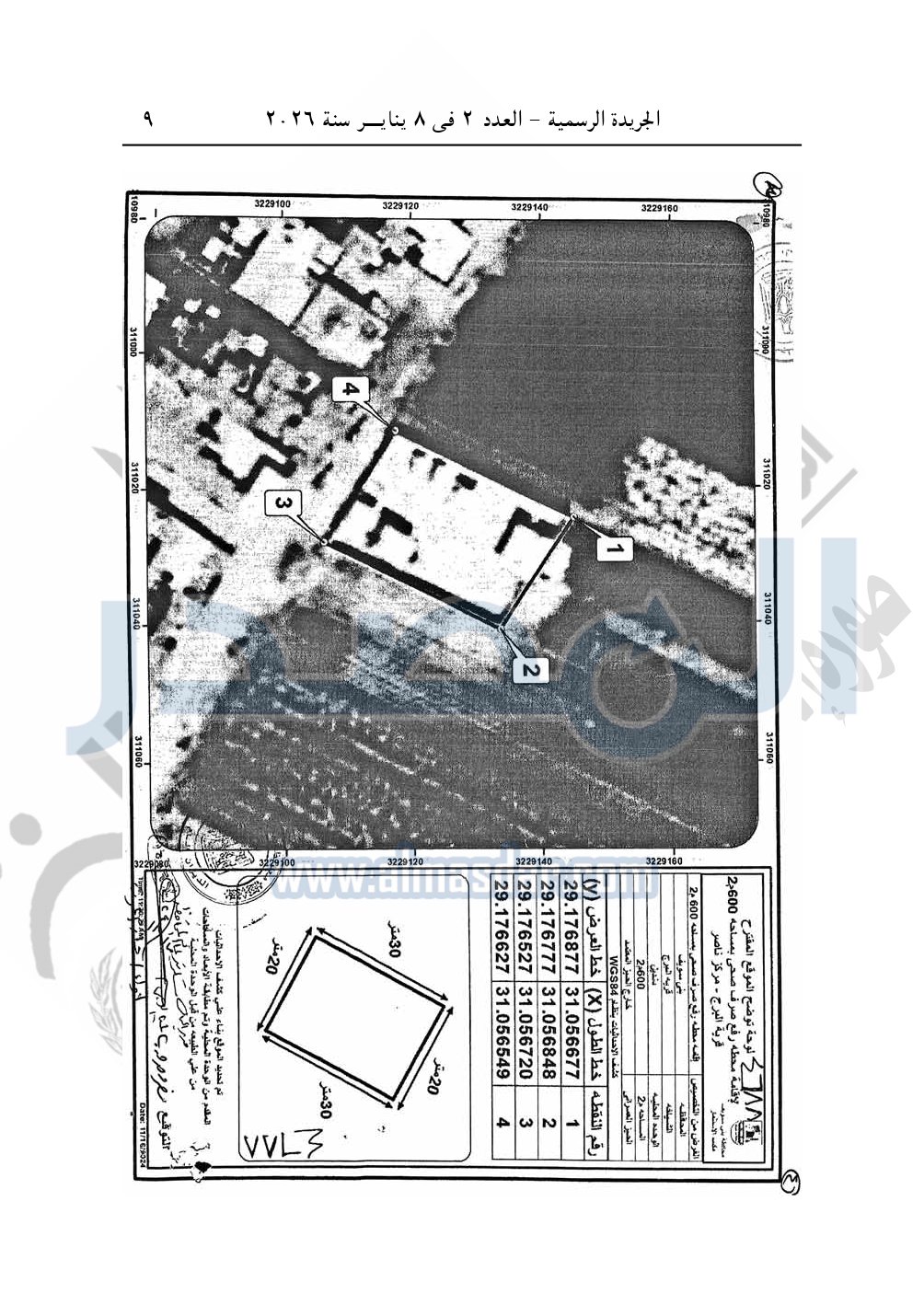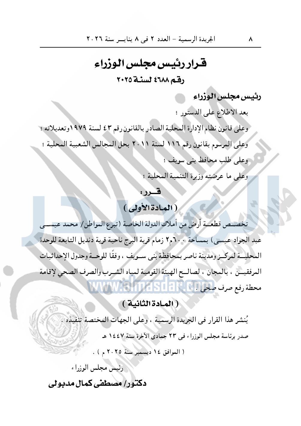 كما نشرت الجريدة الرسمية، في العدد 2، الصادر في 8 يناير 2026، قرار رئيس مجلس الوزراء، رقم 4688 لسنة 2025، بشأن تخصيص قطعة أرض لإقامة محطة رفع صرف صحى بمحافظة بني سويف.