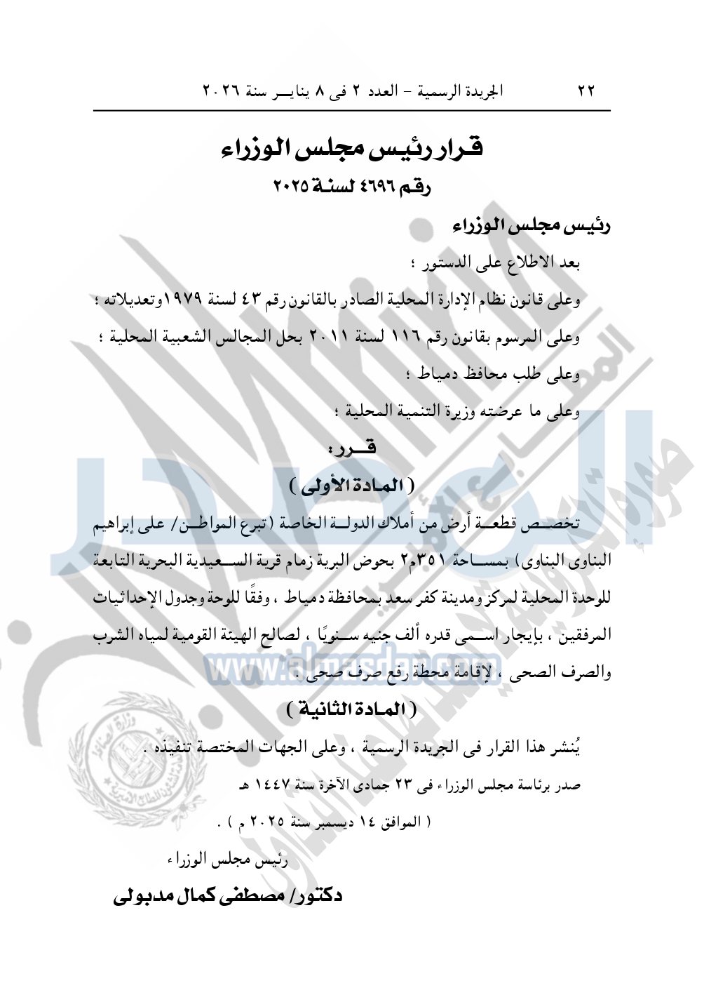 وأيضا نشرت الجريدة الرسمية، في العدد 2، الصادر في 8 يناير 2026، قرار رئيس مجلس الوزراء، رقم 4696 لسنة 2025، بشأن تخصيص قطعة أرض لإقامة محطة رفع صرف صحى بمحافظة دمياط.