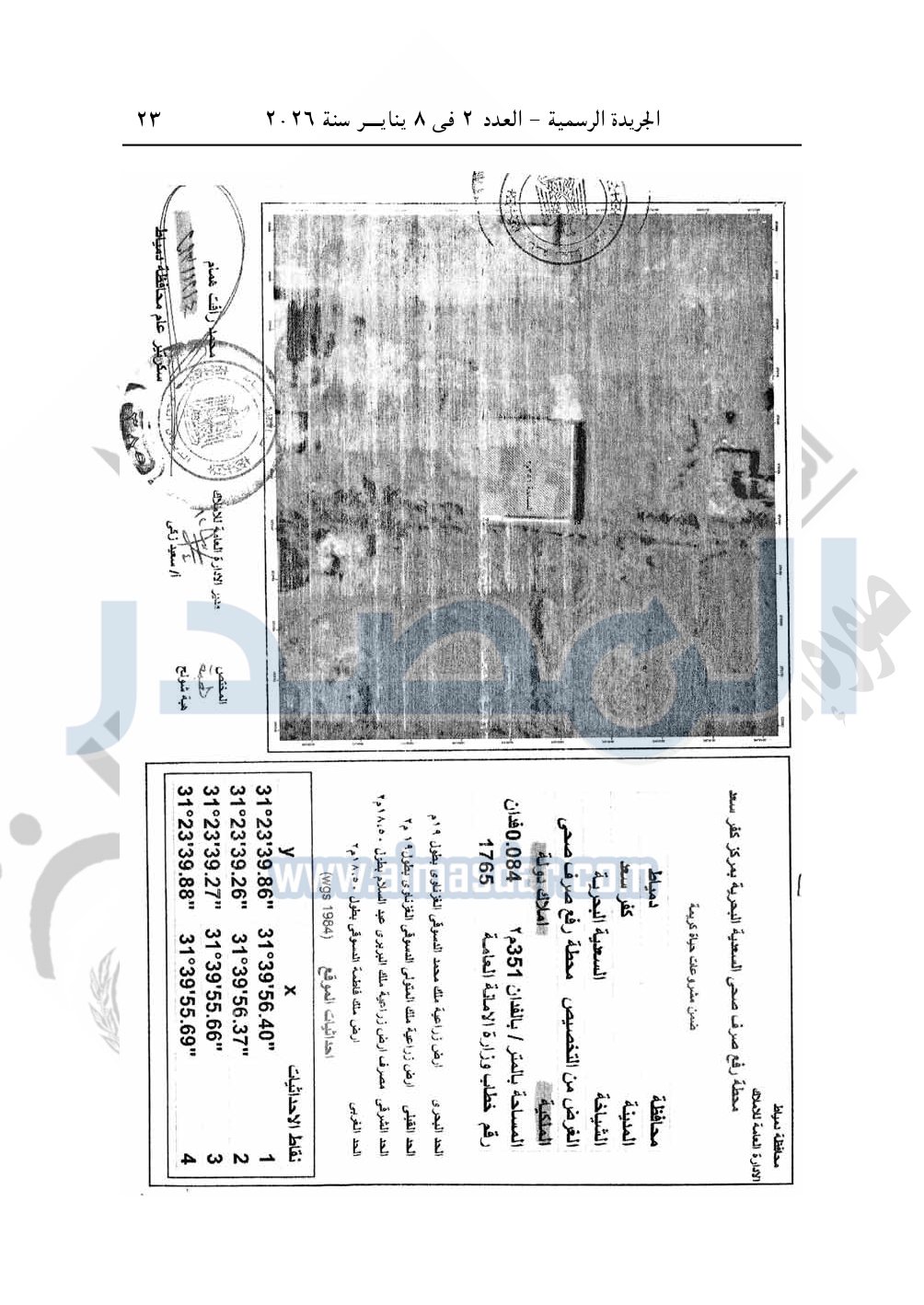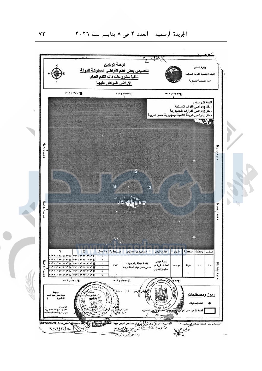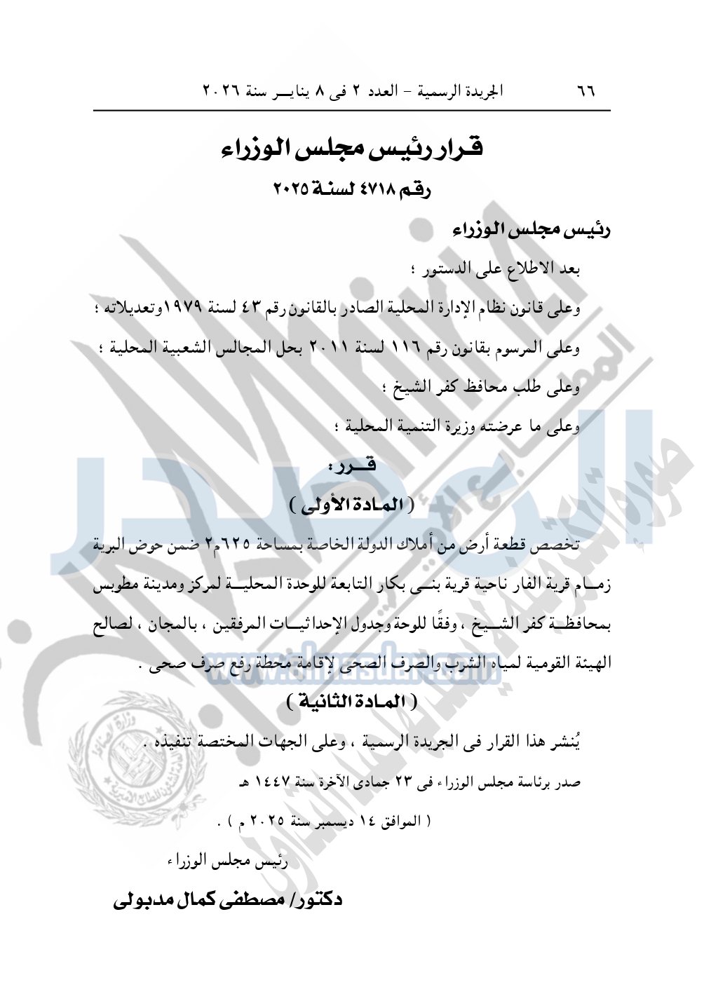 وأيضا نشرت الجريدة الرسمية، في العدد 2، الصادر في 8 يناير 2026، قرار رئيس مجلس الوزراء، رقم 4718 لسنة 2025، بشأن تخصيص قطعة أرض لإقامة محطة رفع صرف صحى بمحافظة كفر الشيخ.