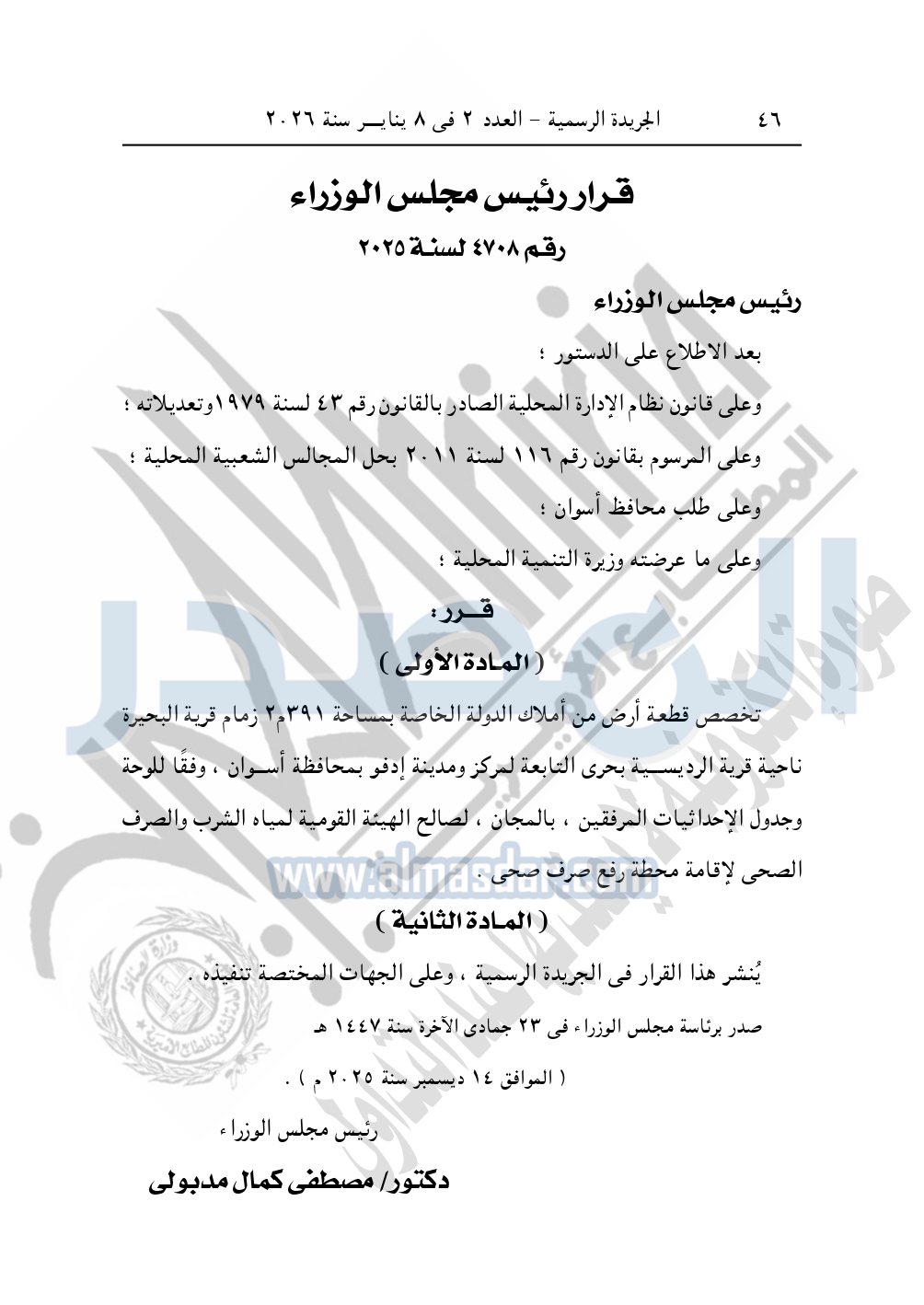 ونشرت الجريدة الرسمية، في العدد 2، الصادر في 8 يناير 2026، قرار رئيس مجلس الوزراء، رقم 4708 لسنة 2025، بشأن تخصيص قطعة أرض لإقامة محطة رفع صرف صحى بمحافظة أسوان.