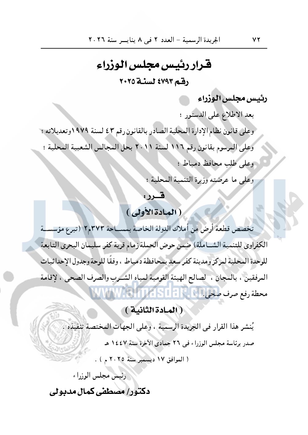 ونشرت الجريدة الرسمية، في العدد 2، الصادر في 8 يناير 2026، قرار رئيس مجلس الوزراء، رقم 4793 لسنة 2025، بشأن تخصيص قطعة أرض لإقامة محطة رفع صرف صحى بمحافظة دمياط.