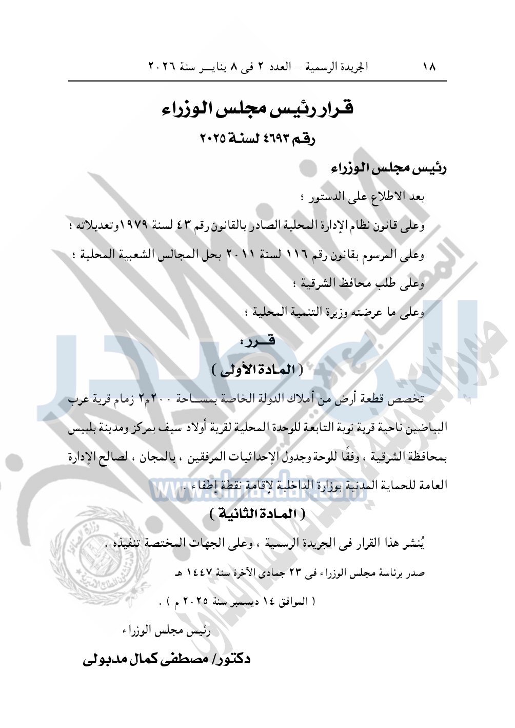 نشرت الجريدة الرسمية، في العدد 2، الصادر في 8 يناير 2026، قرار رئيس مجلس الوزراء، رقم 4693 لسنة 2025، بشأن تخصيص قطعة أرض لإقامة نقطة إطفاء.
