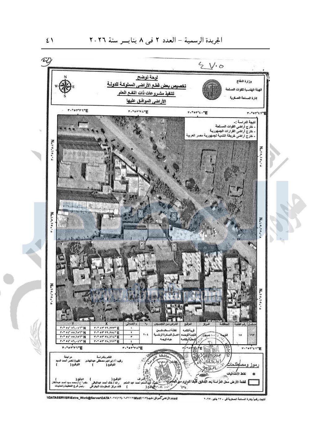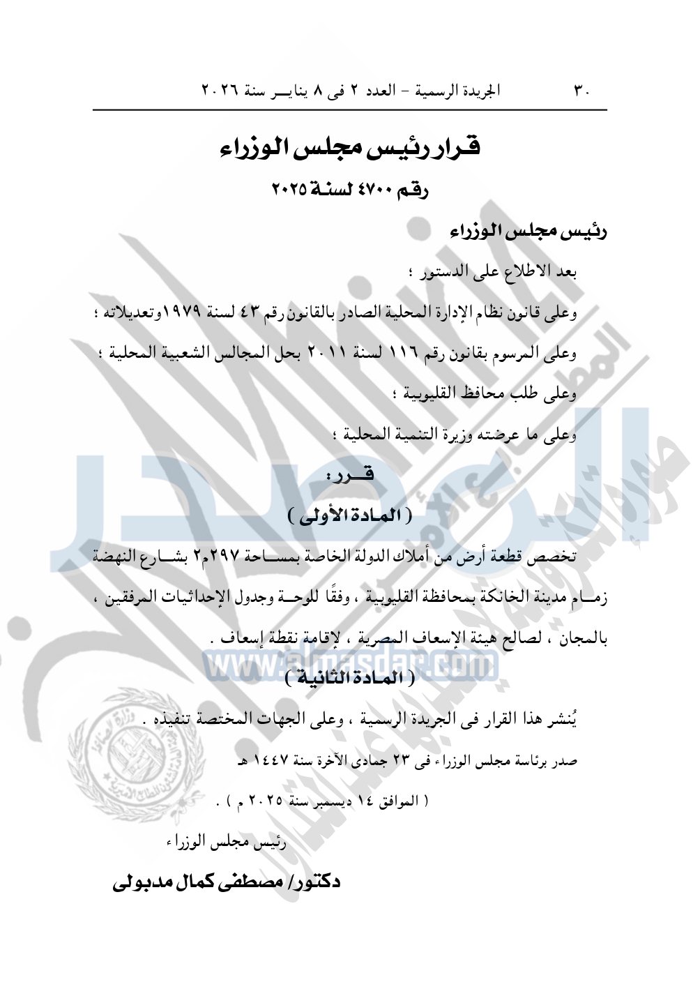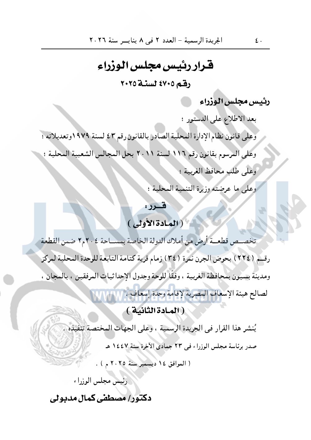 كما نشرت الجريدة الرسمية، في العدد 2، الصادر في 8 يناير 2026، قرار رئيس مجلس الوزراء، رقم 4700 لسنة 2025، بشأن تخصيص قطعة أرض لإقامة نقطة إسعاف.