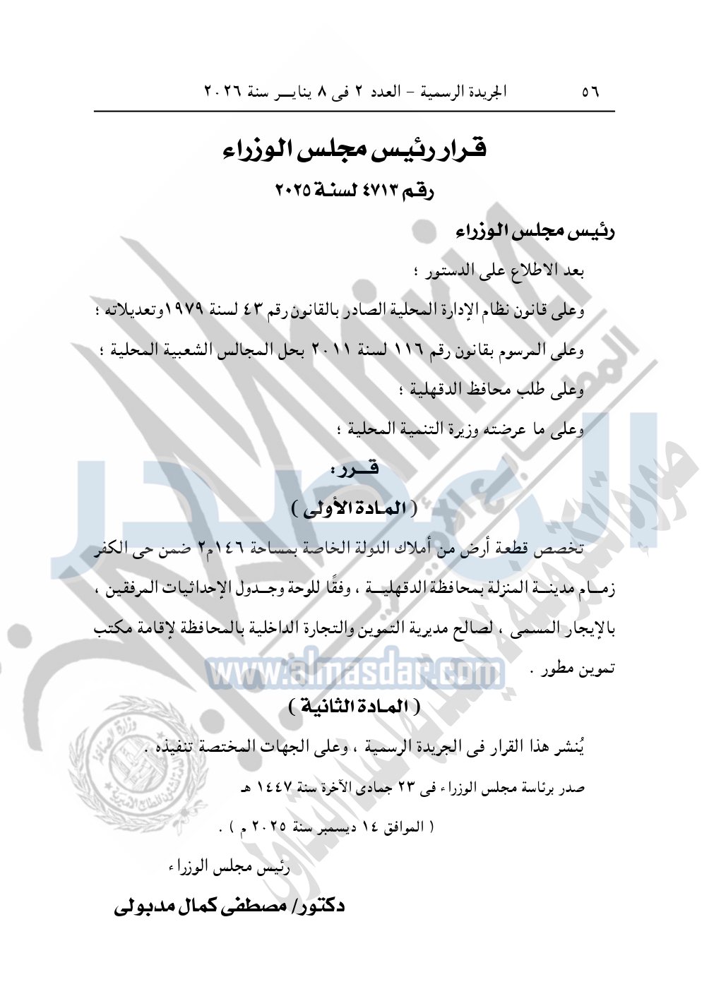 نشرت الجريدة الرسمية، في العدد 2، الصادر في 8 يناير 2026، قرار رئيس مجلس الوزراء، رقم 4713 لسنة 2025، بشأن تخصيص قطعة أرض لإقامة مكتب تموين مطور بمحافظة الدقهلية.