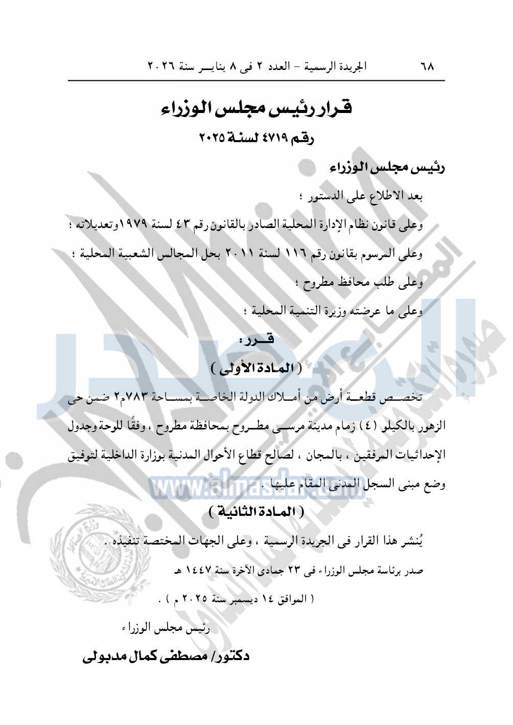 كما نشرت الجريدة الرسمية، في العدد 2، الصادر في 8 يناير 2026، قرار رئيس مجلس الوزراء، رقم 4719 لسنة 2025، بشأن تخصيص قطعة أرض لتوفيق وضع مبنى السجل المدنى بمحافظة مطروح.