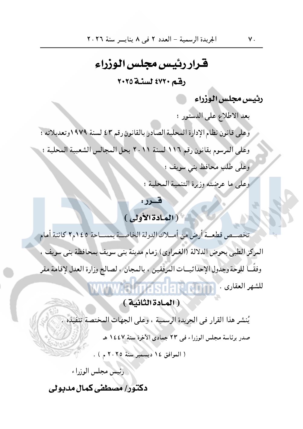 وأيضا نشرت الجريدة الرسمية، في العدد 2، الصادر في 8 يناير 2026، قرار رئيس مجلس الوزراء، رقم 4720 لسنة 2025، بشأن تخصيص قطعة أرض لإقامة مقر للشهر العقارى بمحافظة بنى سويف.