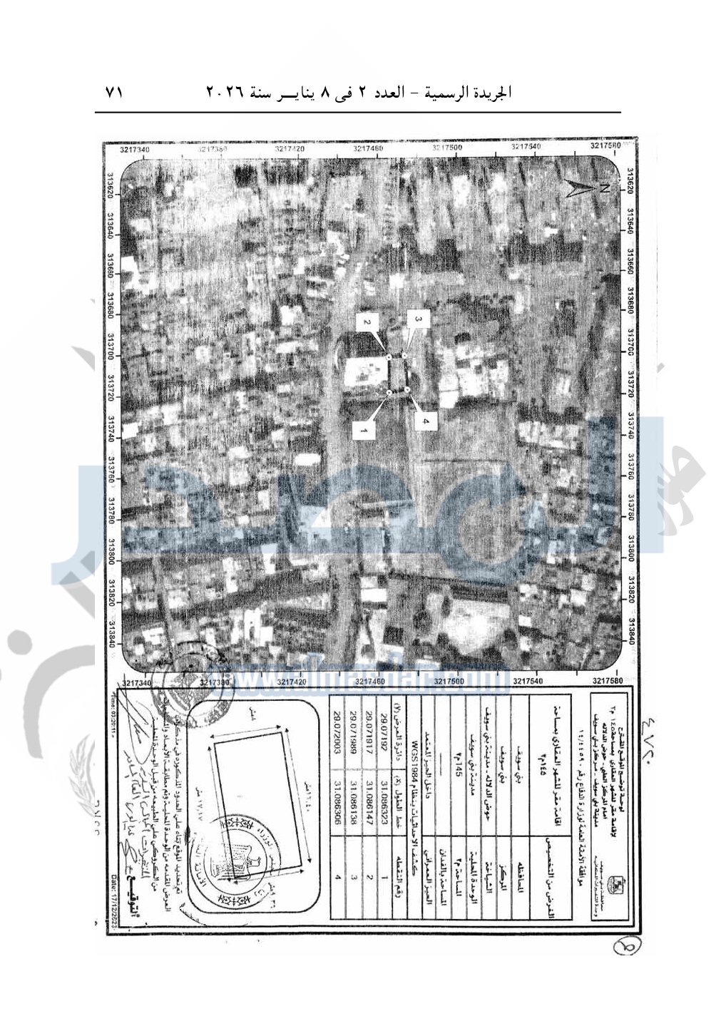 تخصص قطعة أرض من أملاك الدولة الخاصة بمساحة 145م2 كائنة أمام المركز الطبي بحوض الدلالة "الغمراوى" زمام مدينة بنى سويف بمحافظة بنى سويف، وفقا للوحة وجدول الإحداثيات المرفقين ، بالمجان، لصالح وزارة العدل لإقامة مقر للشهر العقارى.