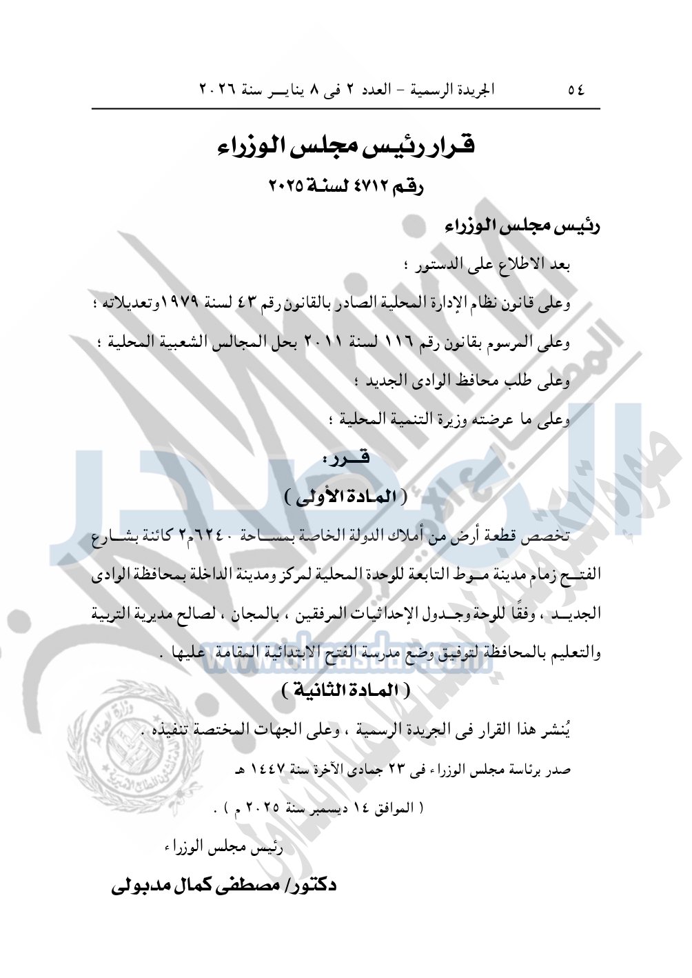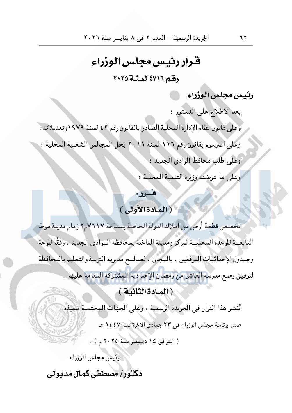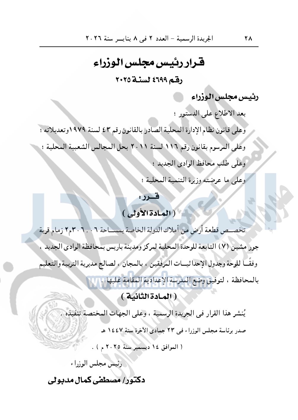 وأيضا نشرت الجريدة الرسمية، في العدد 2، الصادر في 8 يناير 2026، قرار رئيس مجلس الوزراء، رقم 4716 لسنة 2025، بشأن تخصيص قطعة أرض لتوفيق وضع مدرسة العاشر من رمضان الإعدادية المشتركة بمحافظة الوادى الجديد.