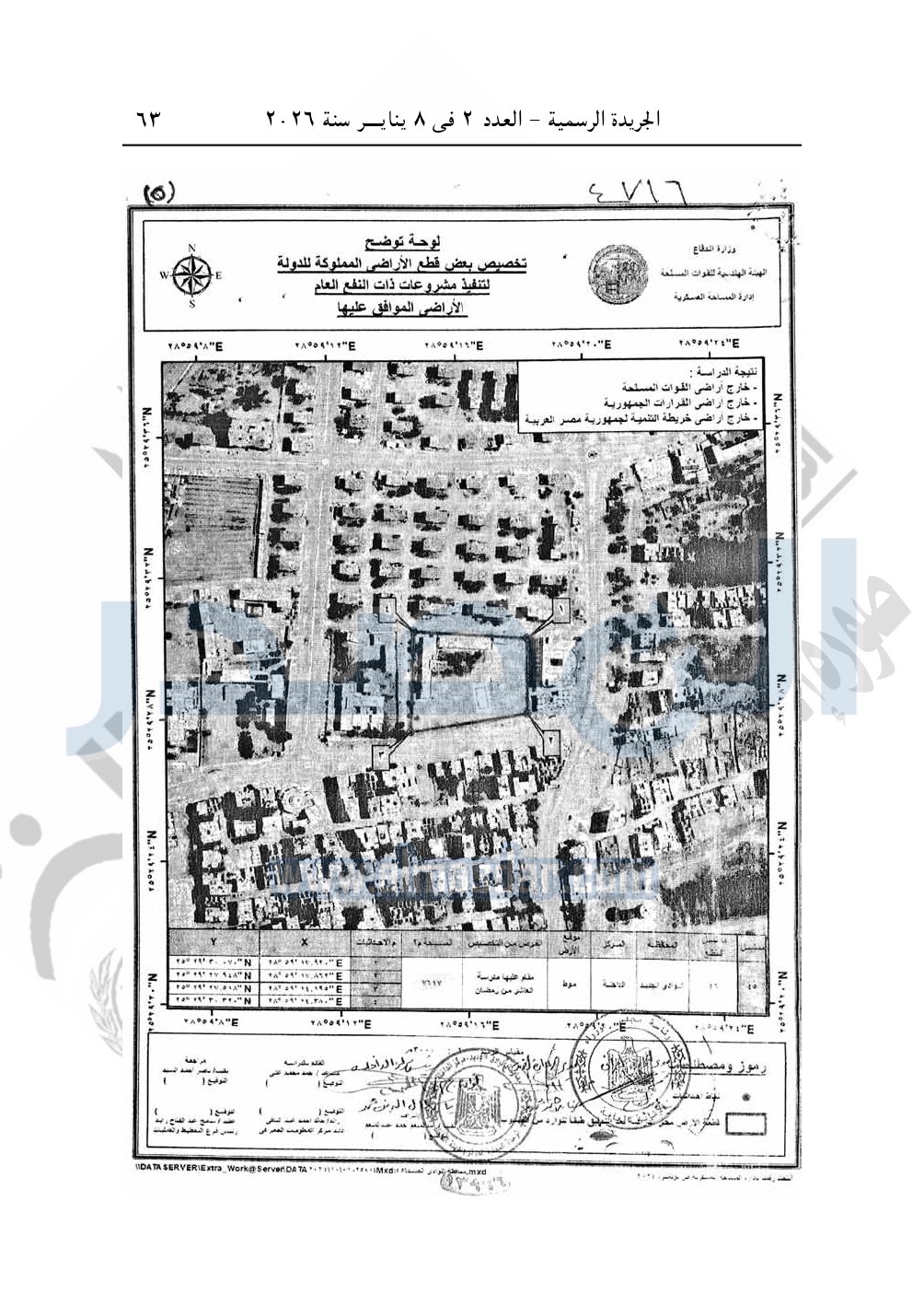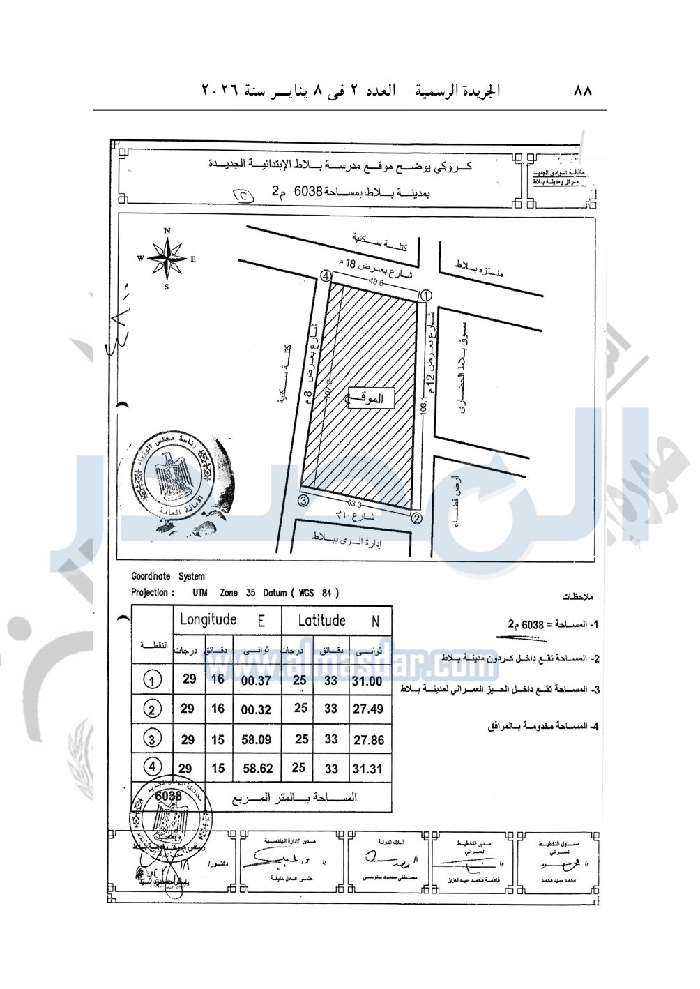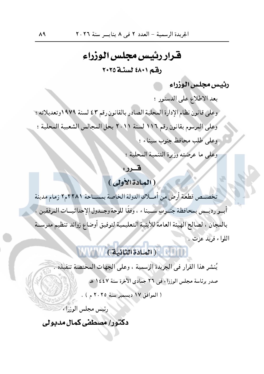 وأيضا نشرت الجريدة الرسمية، في العدد 2، الصادر في 8 يناير 2026، قرار رئيس مجلس الوزراء، رقم 4716 لسنة 2025، بشأن تخصيص قطعة أرض لتوفيق وضع مدرسة العاشر من رمضان الإعدادية المشتركة بمحافظة الوادى الجديد.