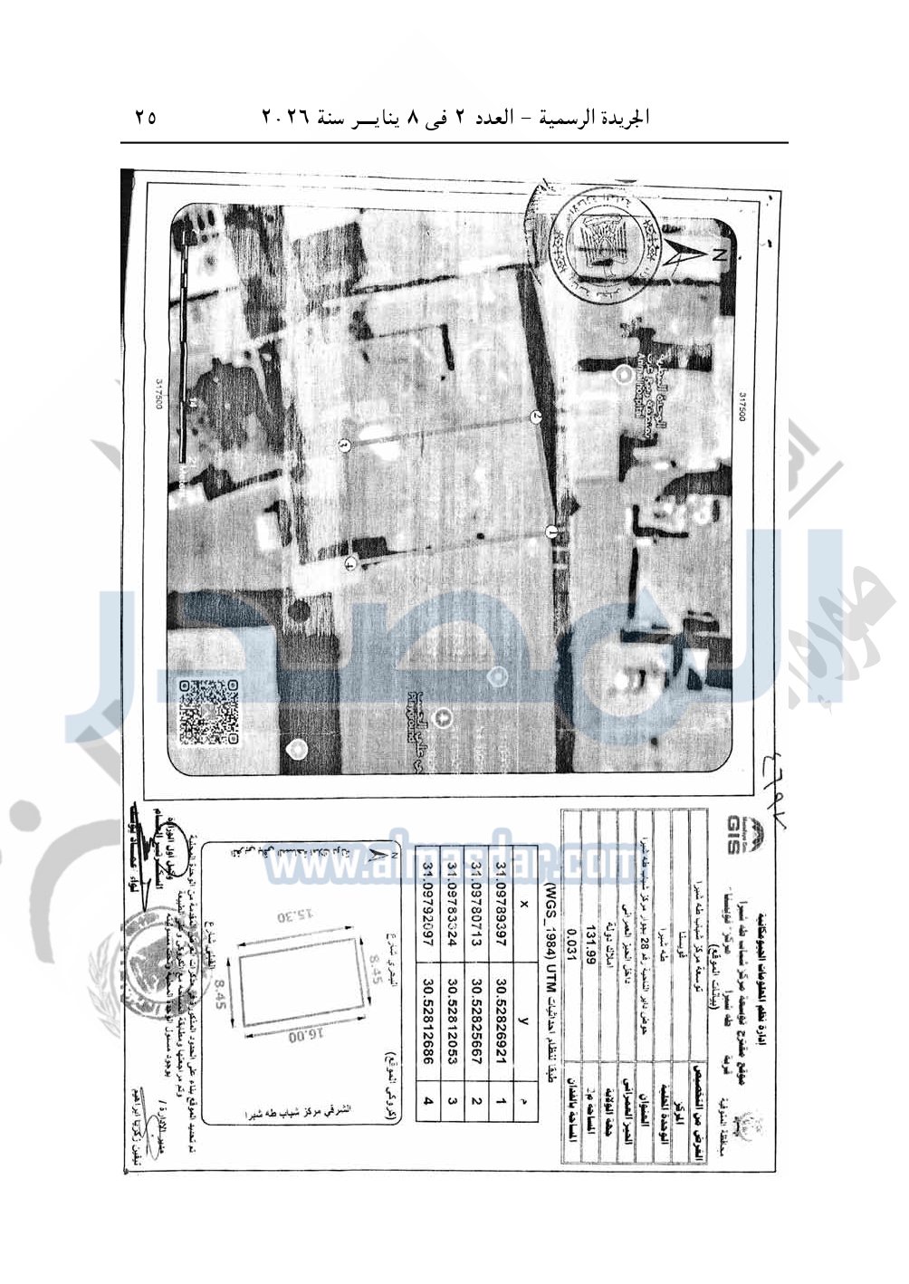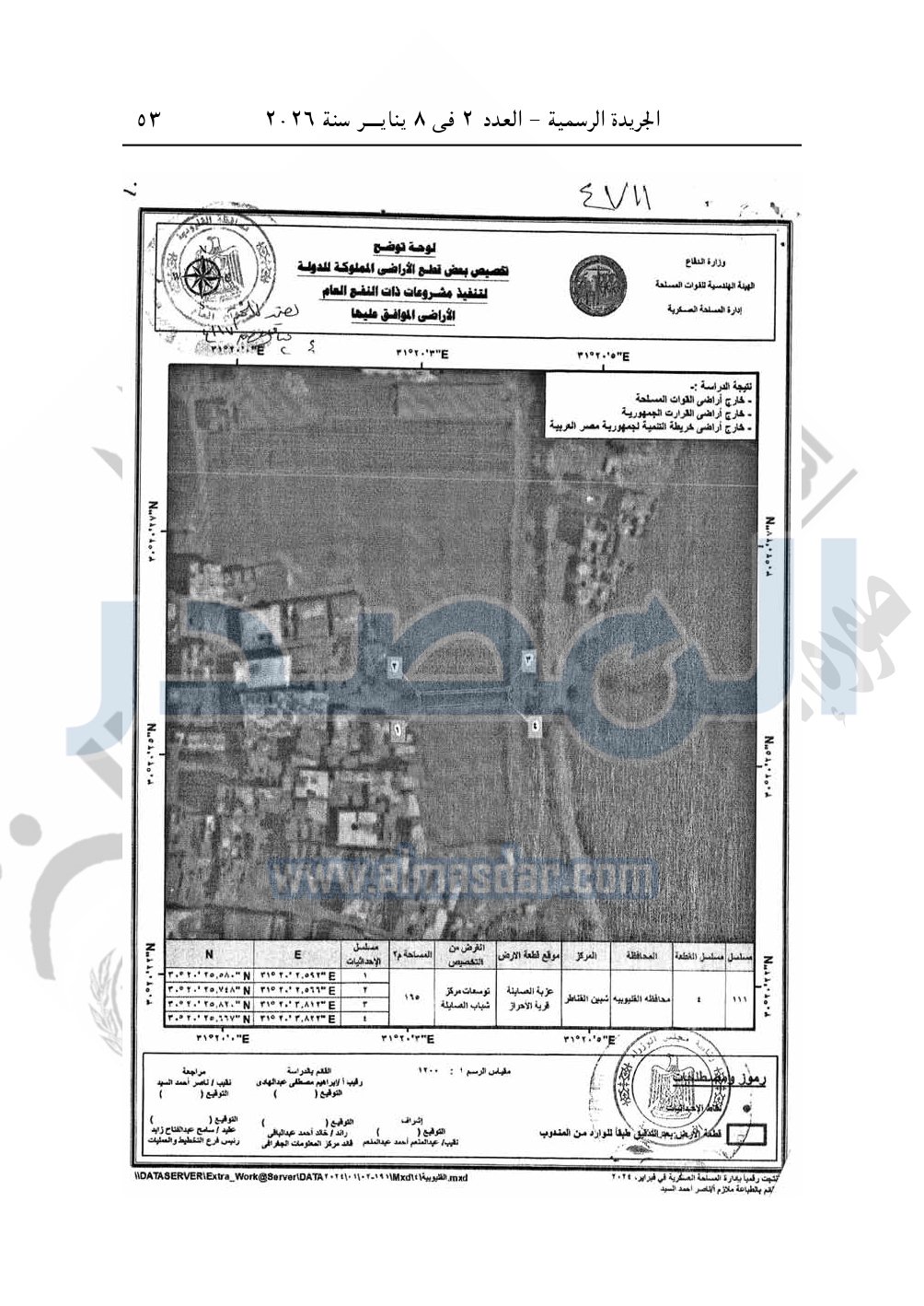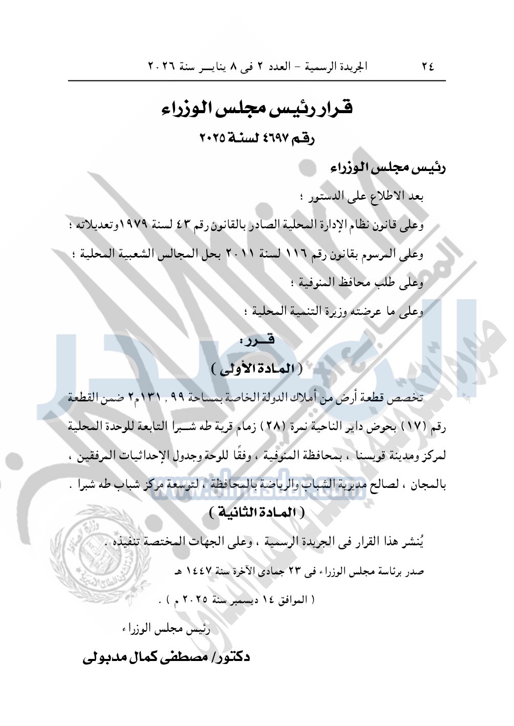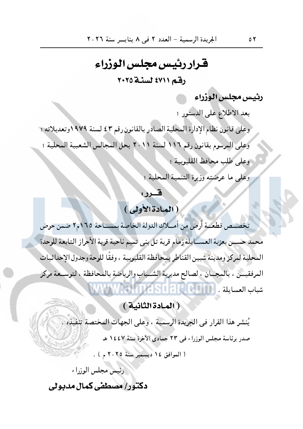كما نشرت الجريدة الرسمية، في العدد 2، الصادر في 8 يناير 2026، قرار رئيس مجلس الوزراء، رقم 4711 لسنة 2025، بشأن تخصيص قطعة أرض لتوسعة مركز شباب العسايلة بمحافظة القليوبية.