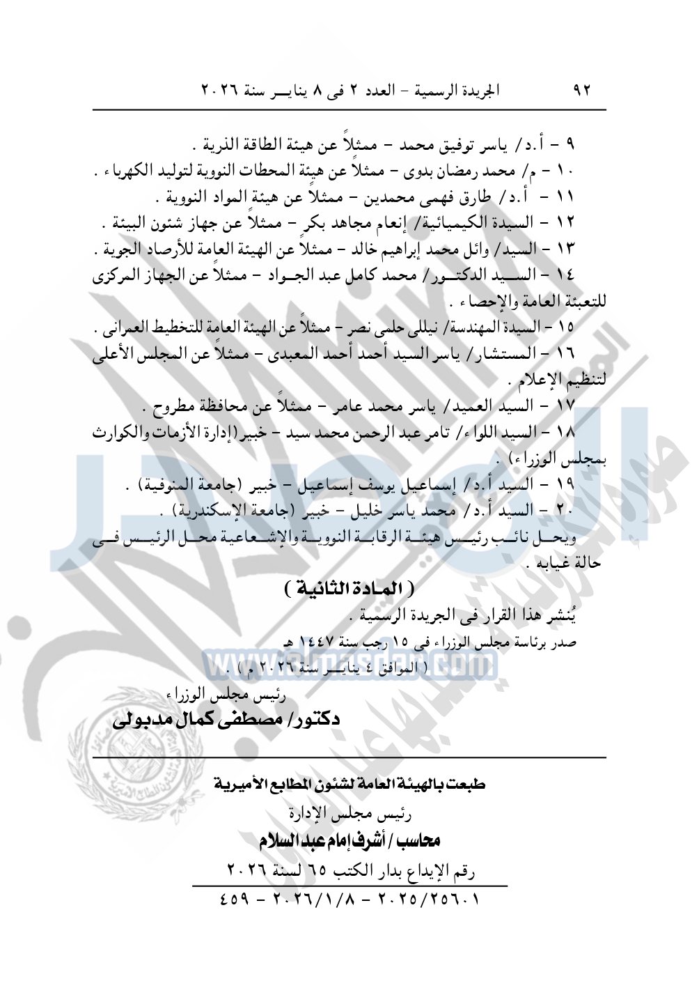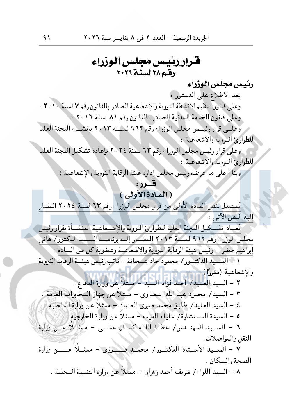 نشرت الجريدة الرسمية، في العدد 2، الصادر في 8 يناير 2026، قرار رئيس مجلس الوزراء، رقم 38 لسنة 2026، بشأن إعادة تشكيل اللجنة العليا للطوارئ النووية والإشعاعية.