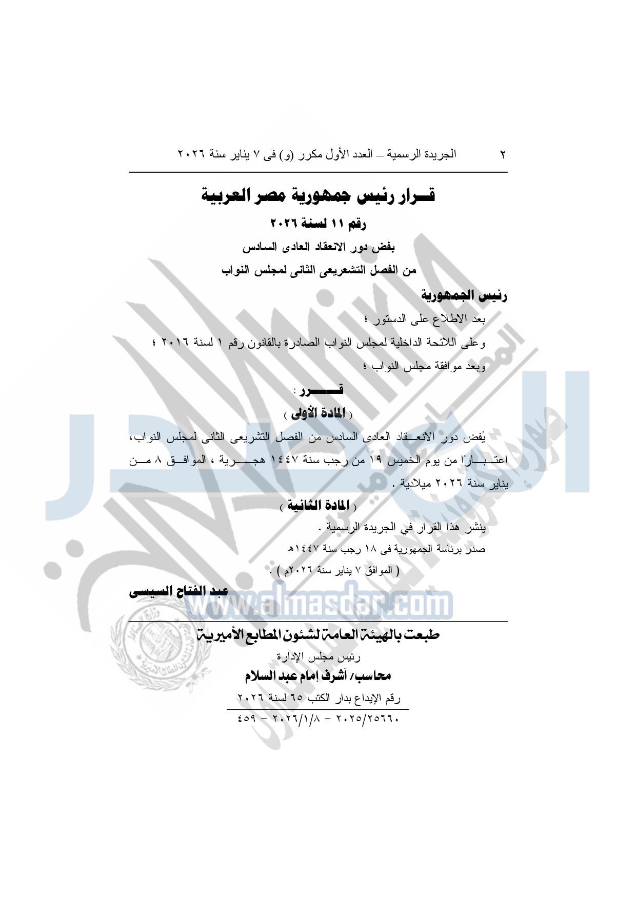 نشرت الجريدة الرسمية، في العدد الأول مكرر "و"، الصادر في 7 يناير سنة 2026، قرار رئيس جمهورية مصر العربية، رقم 11 لسنة 2026، بشأن بفض دور الانعقاد العادي السادس من الفصل التشريعي الثاني لمجلس النواب.