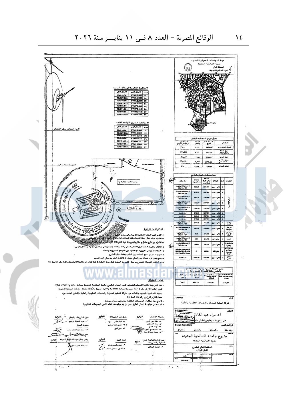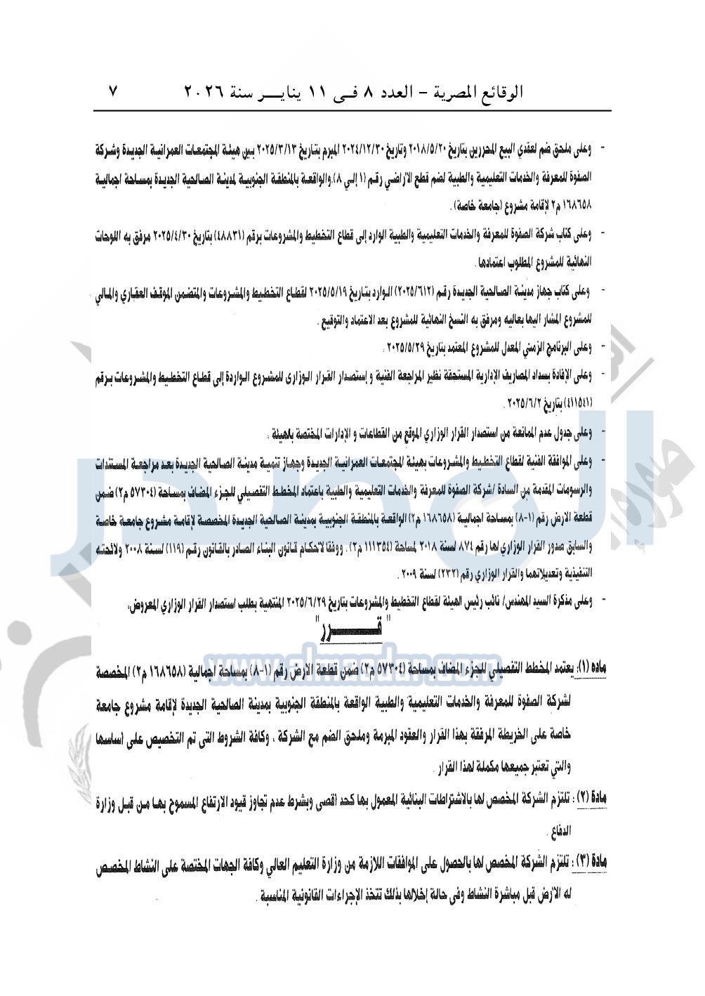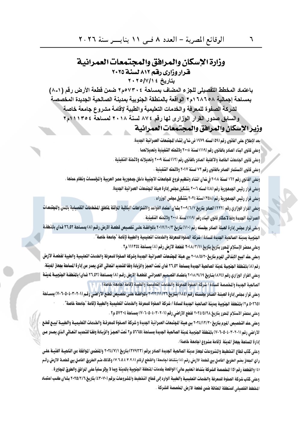 نشرت الوقائع المصرية، في العدد 8، الصادر في 11 يناير سنة 2026، قرار وزارة الإسكان والمرافق والمجتمعات العمرانية، رقم 812 لسنة 2025، بتاريخ 14-7-2025، بشأن اعتماد المخطط التفصيلي للجزء المضاف بمساحة 57304م2 ضمن قطعة الأرض رقم "1 - 8" بمساحة إجمالية 168658م2 الواقعة بالمنطقة الجنوبية بمدينة الصالحية الجديدة المخصصة لشركة الصفوة للمعرفة والخدمات التعليمية والطبية لإقامة مشروع جامعة خاصة والسابق صدور القرار الوزارى لها رقم 874 لسنة 2018 لمساحة 111354م2.