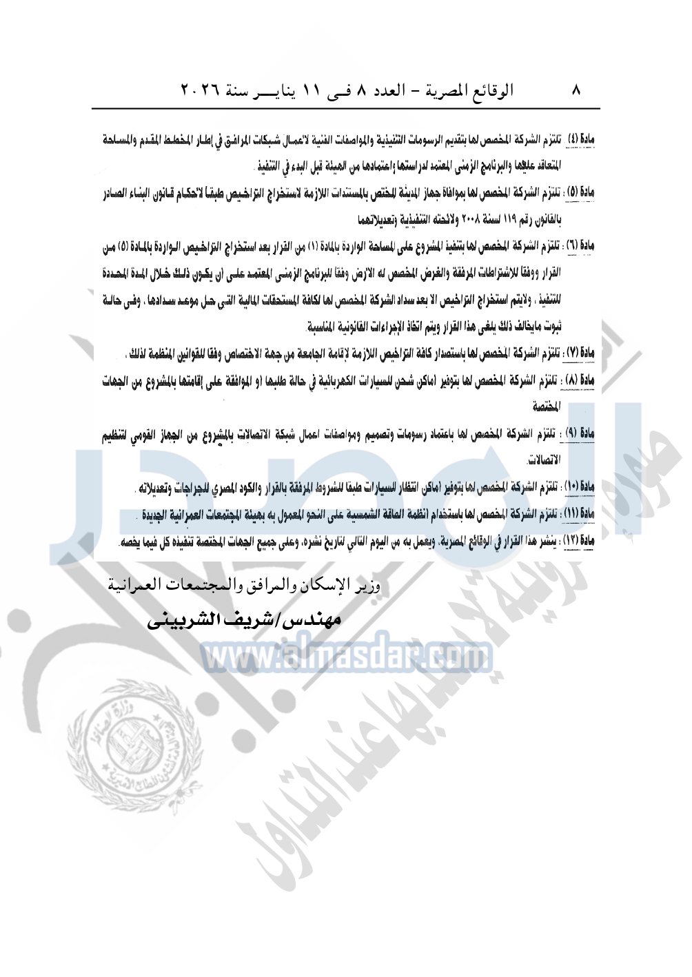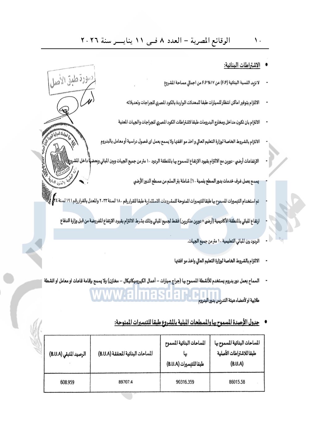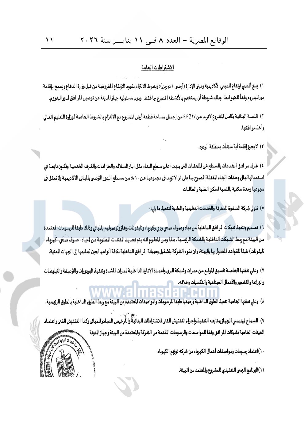 نشرت الوقائع المصرية، في العدد 8، الصادر في 11 يناير سنة 2026، قرار وزارة الإسكان والمرافق والمجتمعات العمرانية، رقم 812 لسنة 2025، بتاريخ 14-7-2025، بشأن اعتماد المخطط التفصيلي للجزء المضاف بمساحة 57304م2 ضمن قطعة الأرض رقم "1 - 8" بمساحة إجمالية 168658م2 الواقعة بالمنطقة الجنوبية بمدينة الصالحية الجديدة المخصصة لشركة الصفوة للمعرفة والخدمات التعليمية والطبية لإقامة مشروع جامعة خاصة والسابق صدور القرار الوزارى لها رقم 874 لسنة 2018 لمساحة 111354م2.