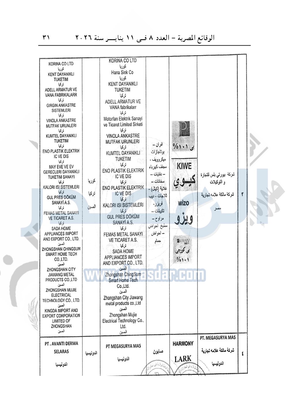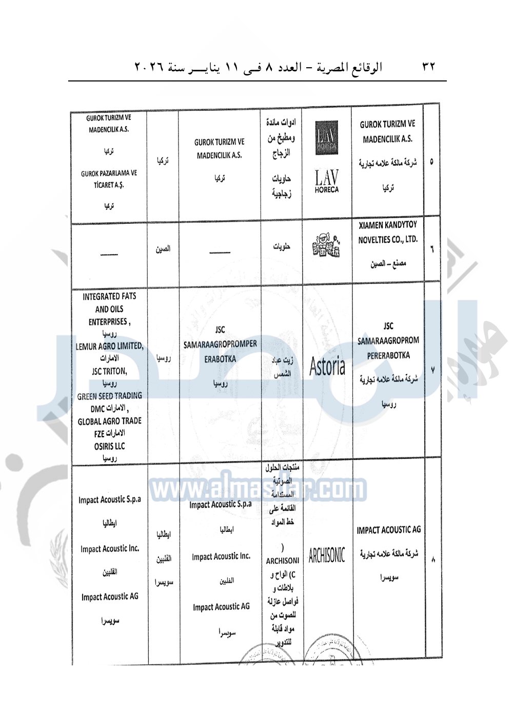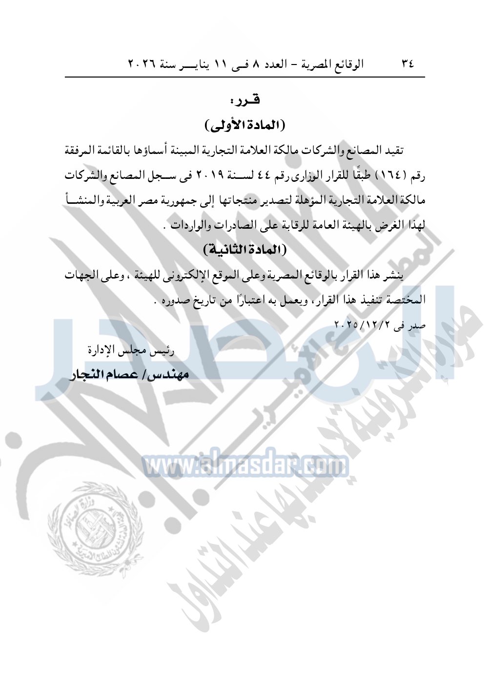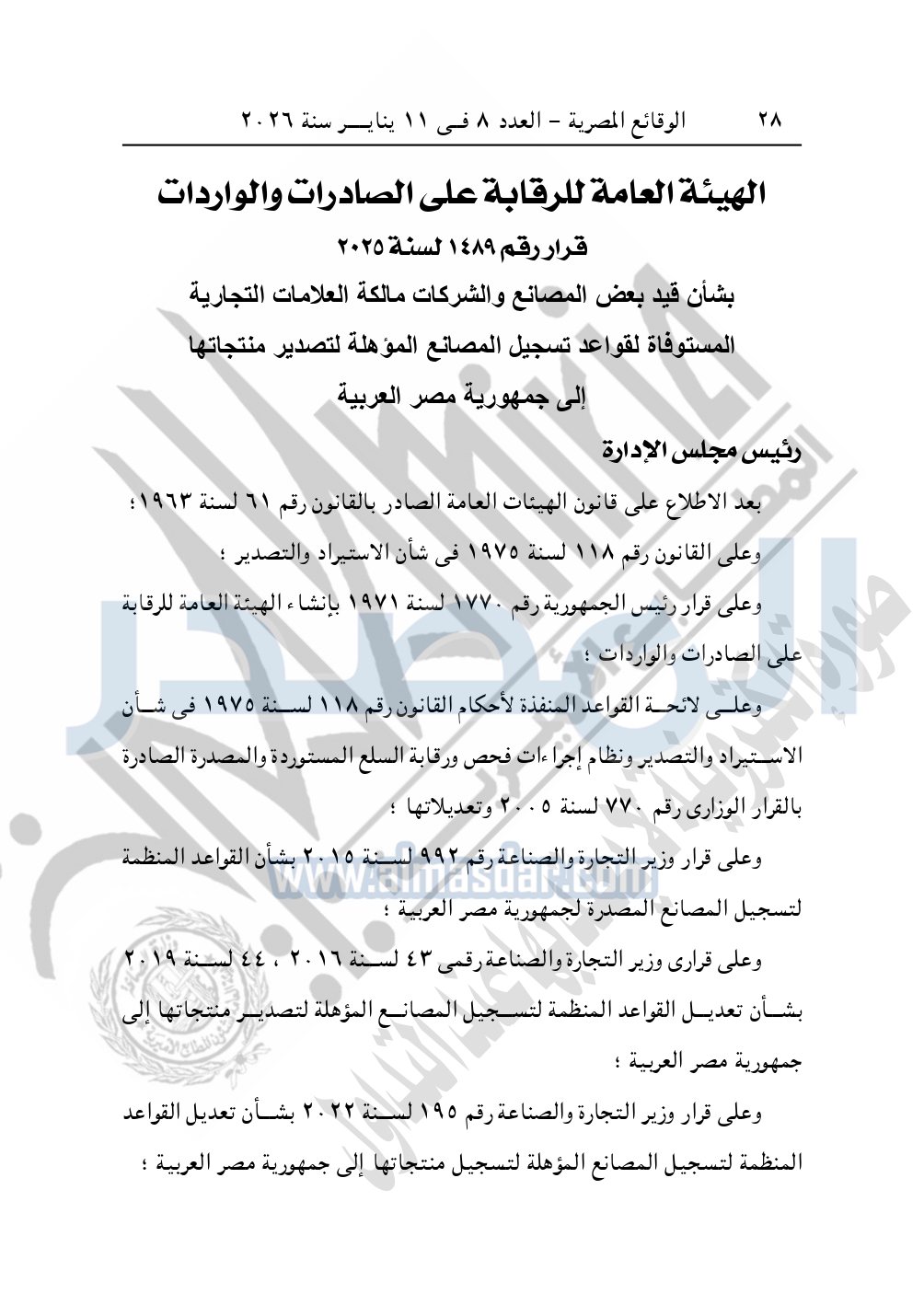 كما نشرت الوقائع المصرية في العدد 8، الصادر في 11 يناير 2026، قرار الهيئة العامة للرقابة على الصادرات والواردات رقم 1490 لسنة 2025، بشأن قيد بعض المصانع والشركات مالكة العلامات التجارية المستوفاة لقواعد تسجيل المصانع المؤهلة لتصدير منتجاتها إلى جمهورية مصر العربية.