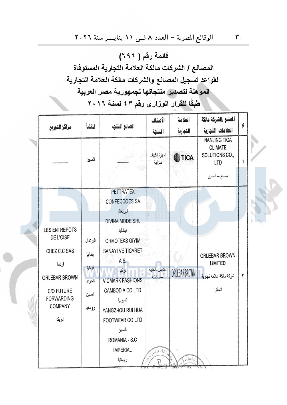 تقيد المصانع والشركات مالكة العلامة التجارية المبينة أسماؤها بالقوائم المرفقة رقم "696" طبقاً للقرار رقم 43 لسنة 2016 في سجل المصانع والشركات مالكة العلامة التجارية المؤهلة لتصدير منتجاتها إلى جمهورية مصر العربية والمنشأ لهذا الغرض بالهيئة العامة للرقابة على الصادرات والواردات.