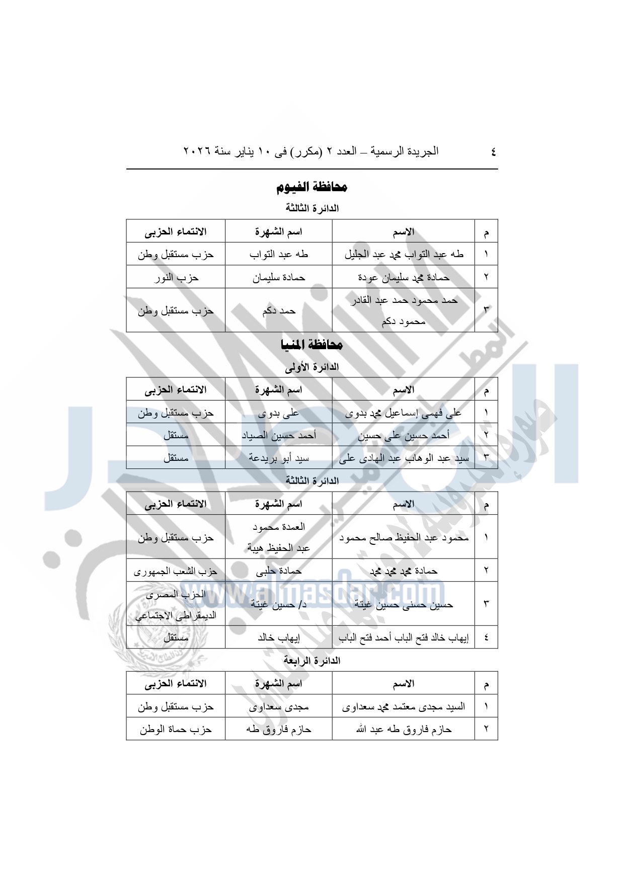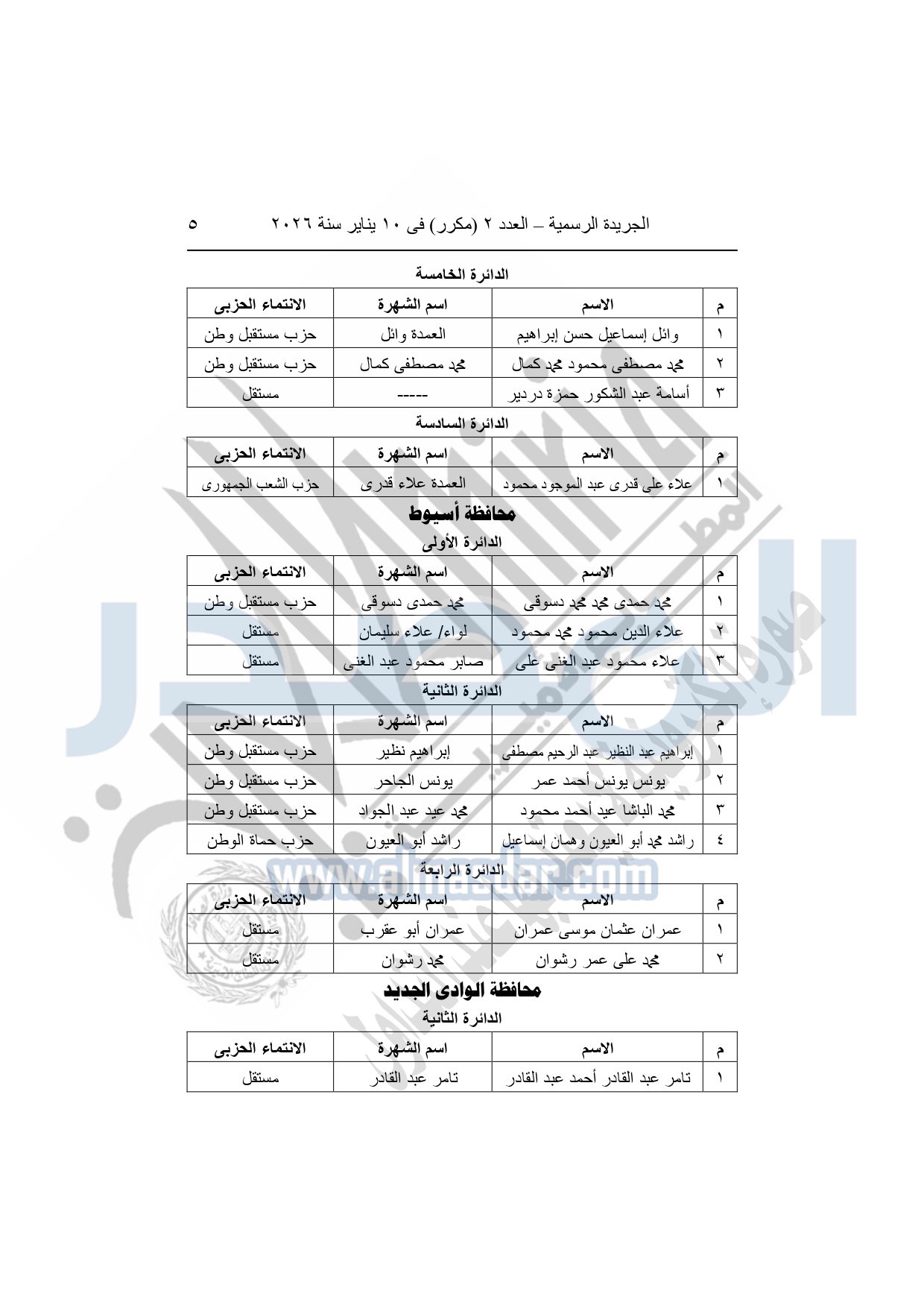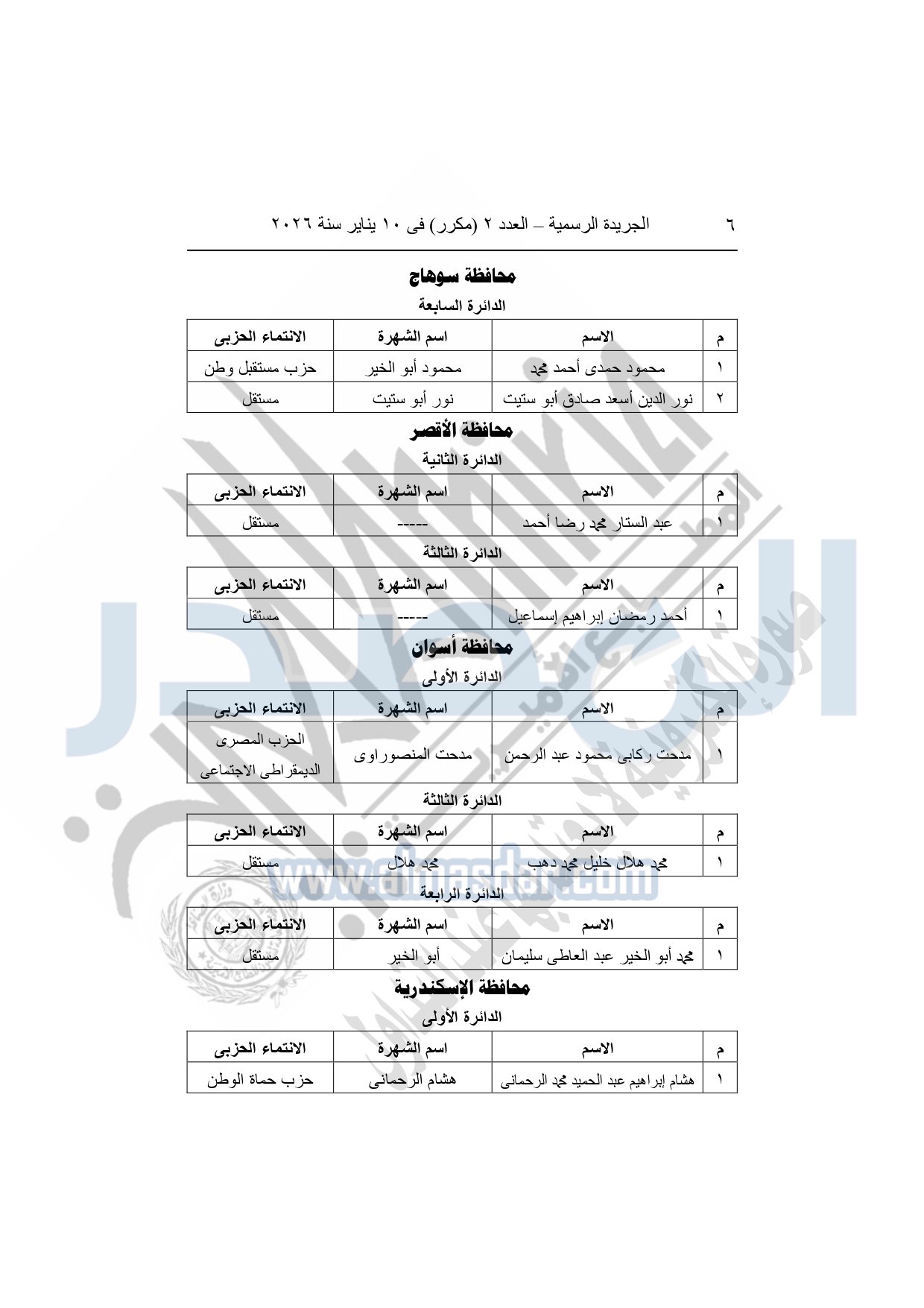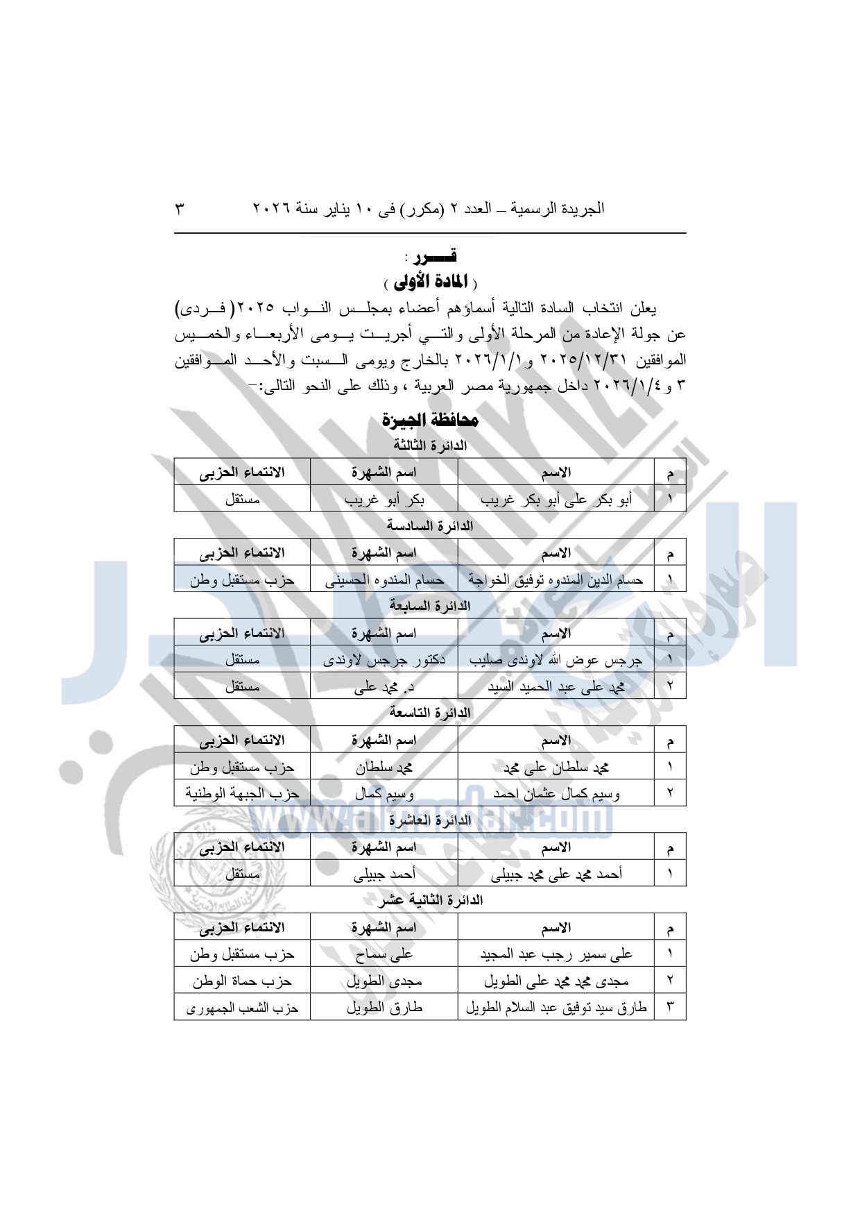 يعلن انتخاب السادة التالية أسماؤهم أعضاء بمجلس النواب 2025 "فردی" عن جولة الإعادة من المرحلة الأولى والتي أجريت يومى الأربعاء والخميس الموافقين 31-12-2025 و1-1-2026 بالخارج ويومي السبت والأحد الموافقين 3 و4-1-2026 داخل جمهورية مصر العربية، وذلك على النحو التالي: