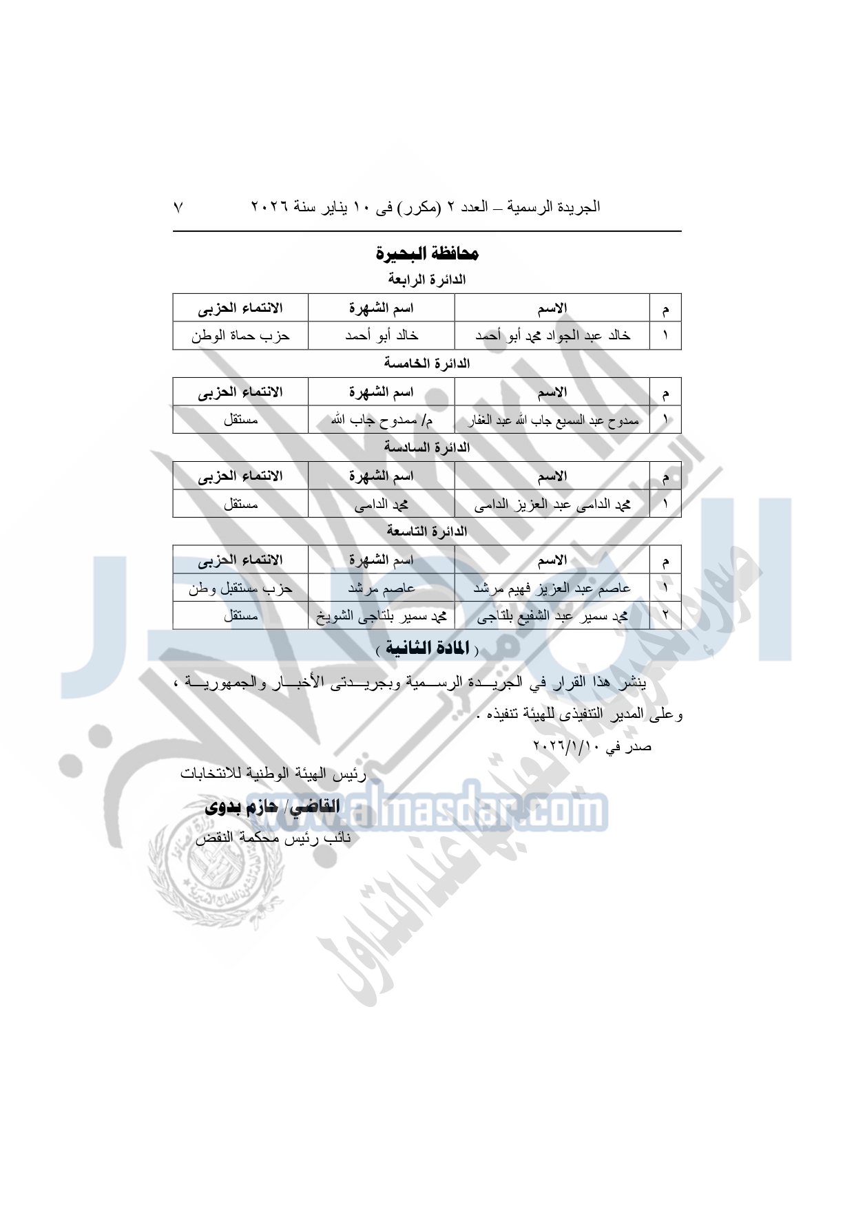 نشرت الجريدة الرسمية في العدد 2 "مكرر"، الصادر في 10 يناير سنة 2026، قرار الهيئة الوطنية للانتخابات، رقم 2 لسنة 2026، بشأن إعلان النتيجة النهائية لجولة الإعادة للمرحلة الأولى لبعض الدوائر عن المقاعد المخصصة للنظام الفردى لانتخابات مجلس النواب التي أجريت يومى الأربعاء والخميس 31-12-2025 و1-1-2026 بالخارج ويومي السبت والأحد 3 و4-1-2026 داخل جمهورية مصر العربية.