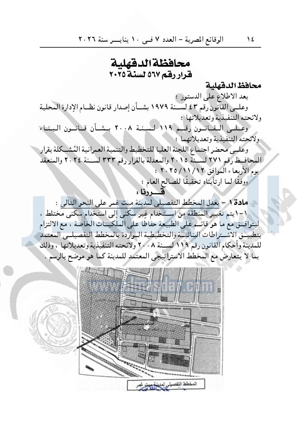 نشرت الوقائع المصرية في العدد 7، الصادر في 10 يناير سنة 2026، قرار محافظة الدقهلية، رقم 567 لسنة 2025، بشأن تعديل المخطط التفصيلي لمدينة ميت غمر.