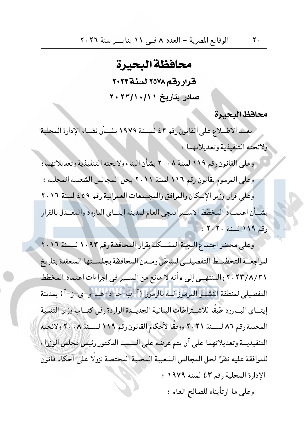 كما نشرت الوقائع المصرية في العدد 8، الصادر في 11 يناير سنة 2026، قرار محافظة البحيرة، رقم 2578 لسنة 2023، صادر بتاريخ 11-10-2023، بشأن إعتماد المخطط التفصيلي لمنطقة النشو.