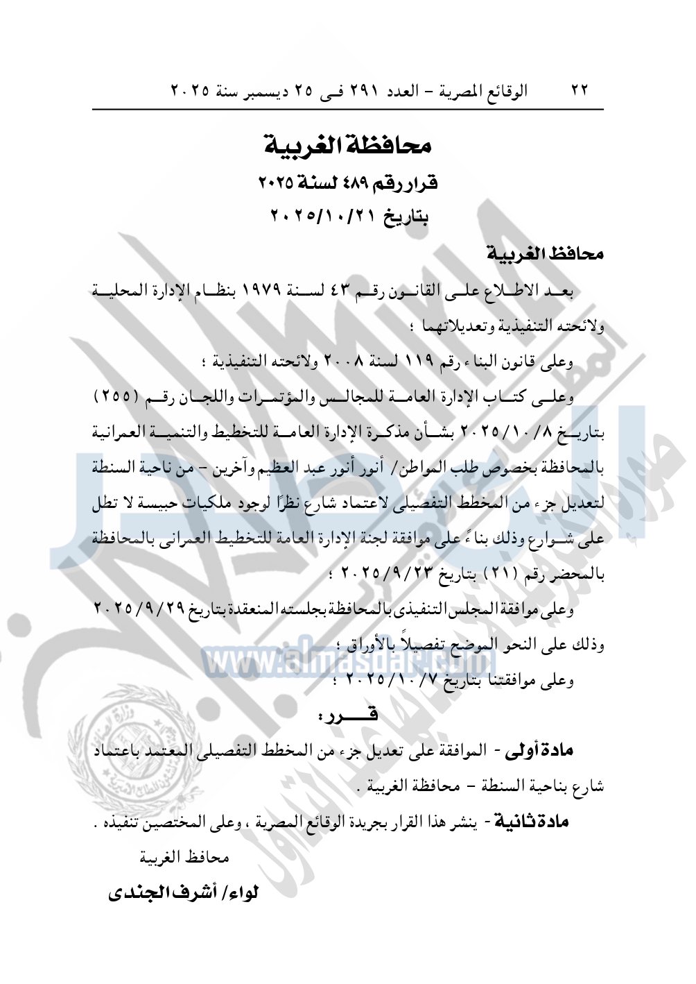 وأيضا نشرت الوقائع المصرية في العدد 291، الصادر في 25 ديسمبر سنة 2025، قرار محافظة الغربية، رقم 489 لسنة 2025، صادر بتاريخ 21-10-2025، بشأن الموافقة على تعديل جزء من المخطط التفصيلي المعتمد باعتماد شارع بناحية السنطة – محافظة الغربية.