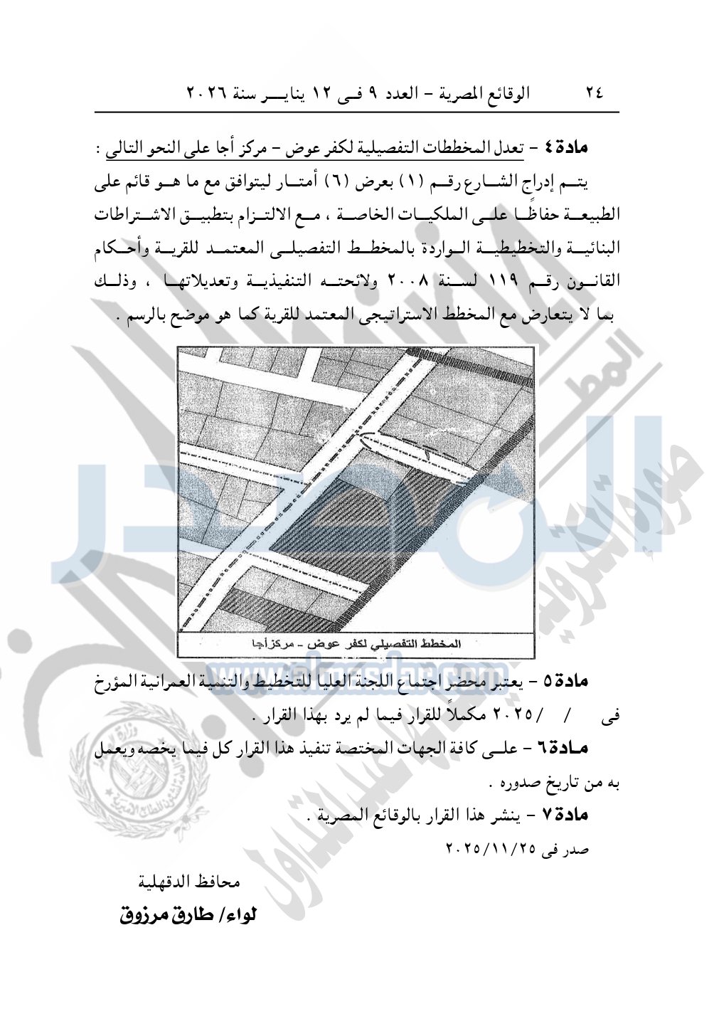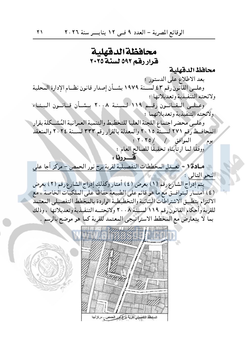 نشرت الوقائع المصرية، في العدد 9، الصادر في 12 يناير سنة 2026، قرار محافظة الدقهلية، رقم 592 لسنة 2025، بشأن تعديل المخططات التفصيلية لـ 4 قرى في محافظة الدقهلية.