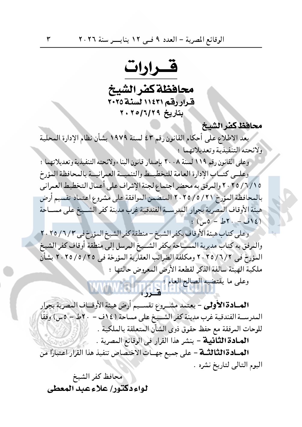نشرت الوقائع المصرية، في العدد 9، الصادر في 12 يناير سنة 2026، قرار محافظة كفر الشيخ، رقم 11431 لسنة 2025، بتاريخ 29-6-2025، بشأن إعتماد مشروع تقسيم أرض هيئة الأوقاف المصرية.