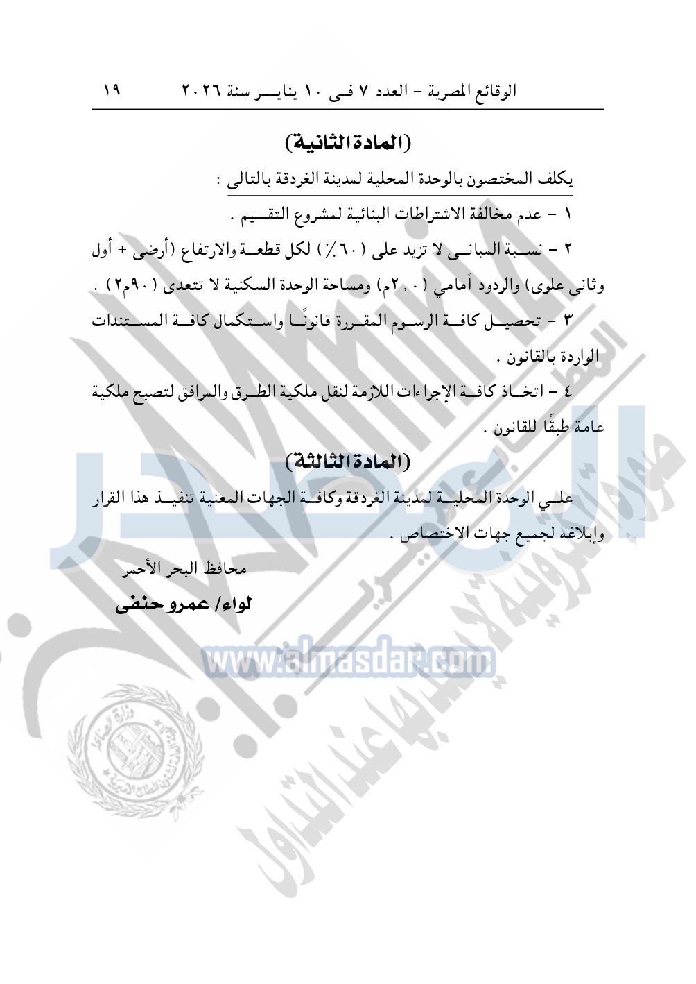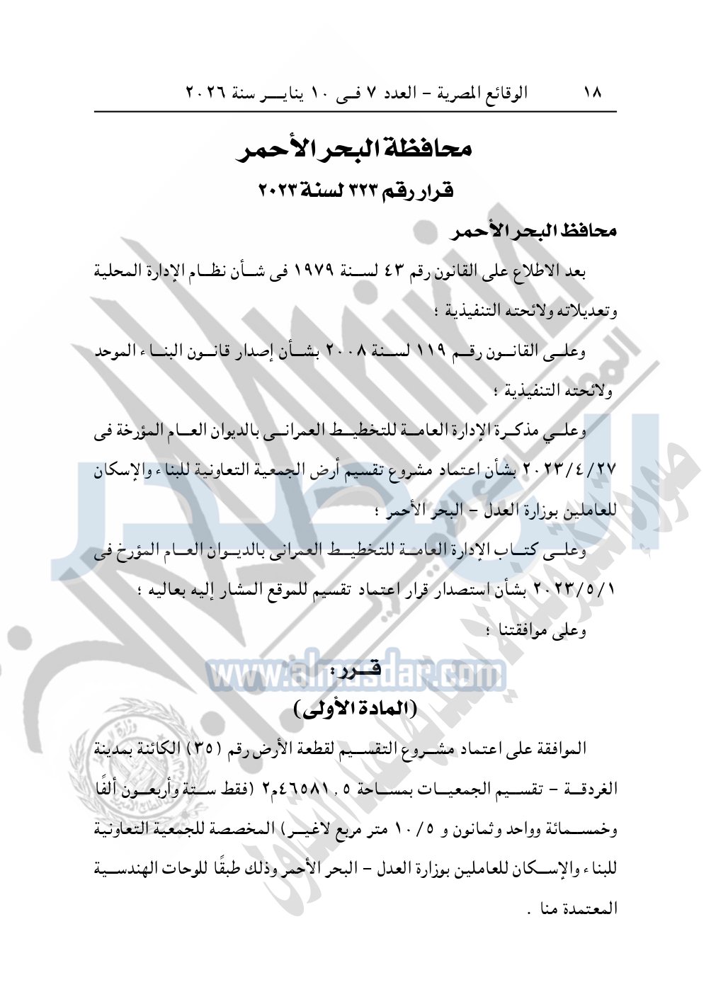 كما نشرت الوقائع المصرية، في العدد 7، الصادر في 10 يناير سنة 2026، قرار محافظة البحر الأحمر، رقم 323 لسنة 2023، بشأن الموافقة على اعتماد مشروع أرض مشروع تقسيم أرض الجمعية التعاونية للبناء والإسكان للعاملين بوزارة العدل.