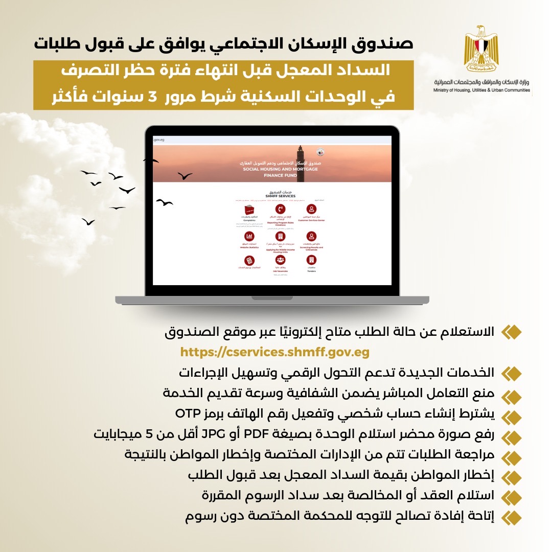 أعلنت مي عبد الحميد، الرئيس التنفيذي لصندوق الإسكان الاجتماعي ودعم التمويل العقاري، عن الموافقة على قبول طلبات السداد المعجل قبل انتهاء فترة حظر التصرف في الوحدات السكنية وذلك للوحدات التى مر على استلامها أكثر من 3 سنوات.