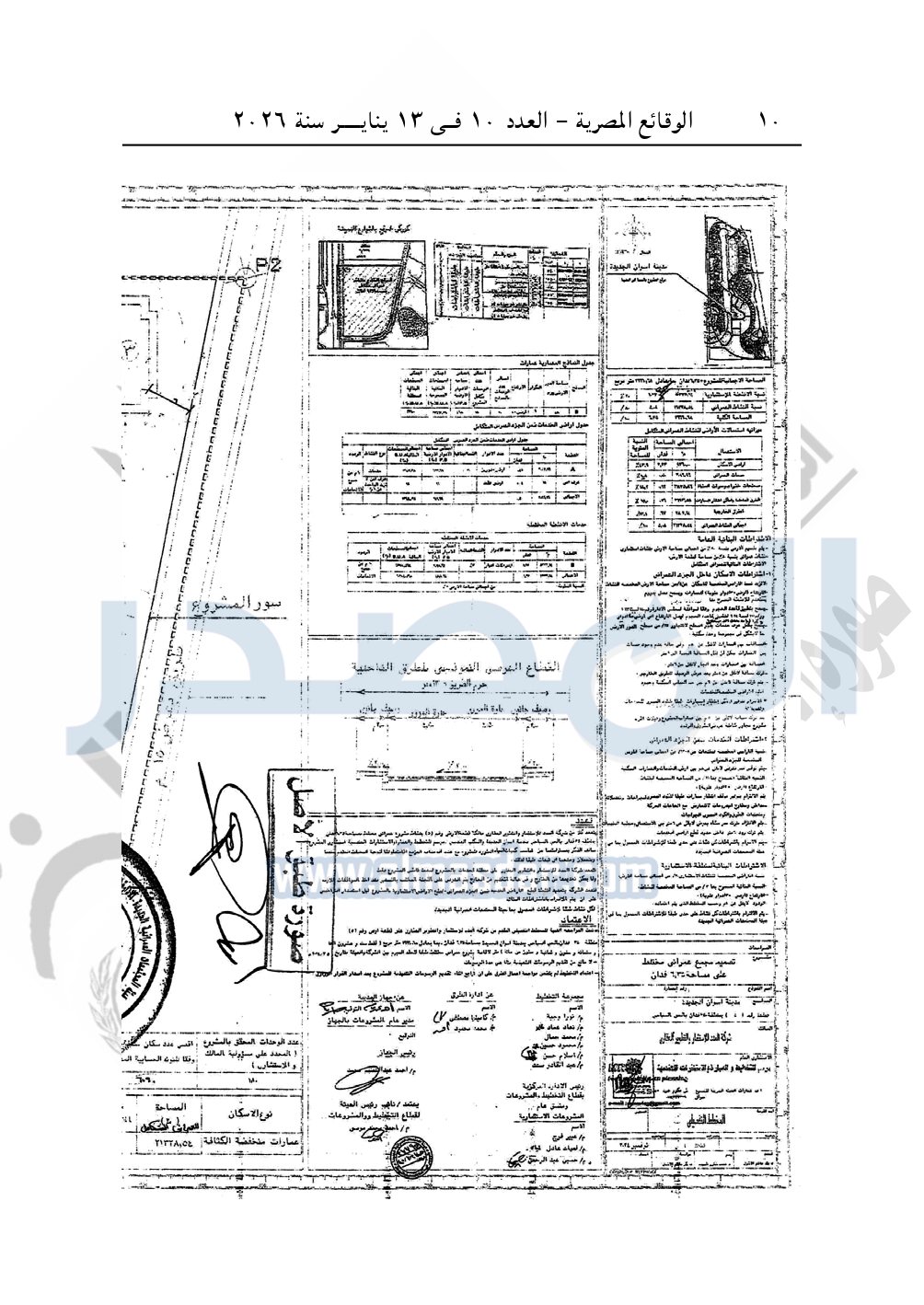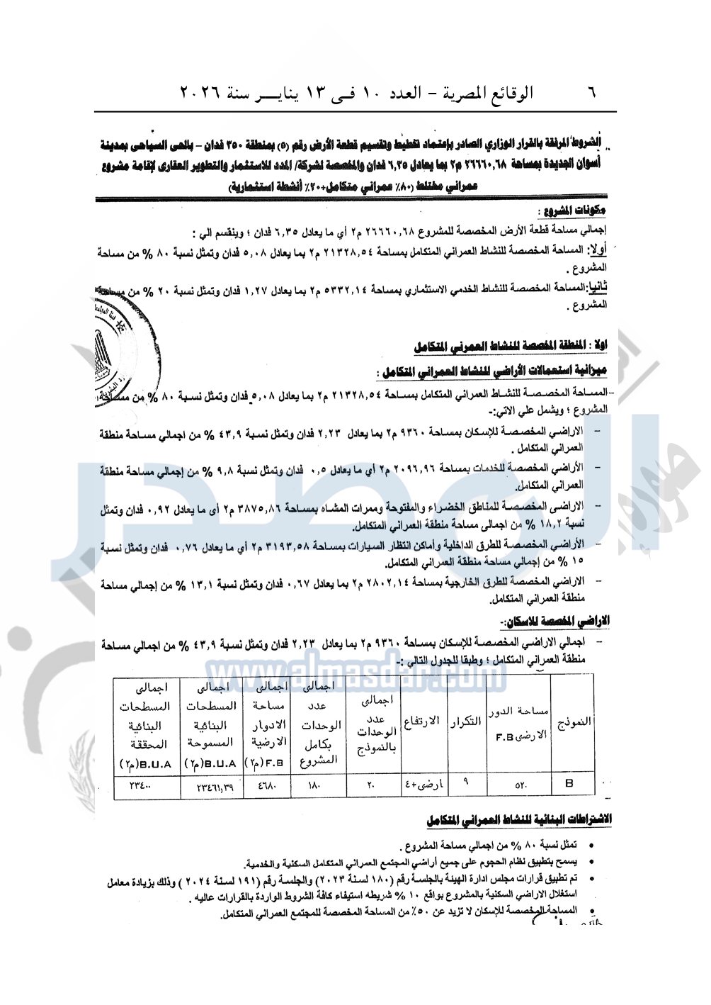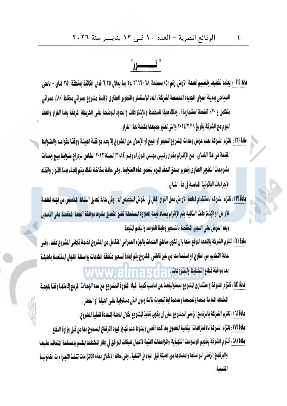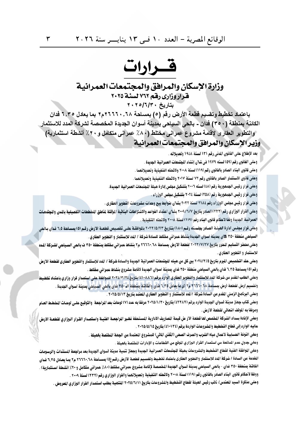 نشرت الوقائع المصرية، في العدد 10، الصادر في 13 يناير سنة 2026، قرار وزارة الإسكان والمرافق والمجتمعات العمرانية، رقم 762 لسنة 2025، بتاريخ 30-6-2025، بشأن اعتماد تخطيط وتقسيم قطعة أرض بمساحة 26660.68م2 بما يعادل 6.35 فدان الكائنة بمنطقة "350" فدان - بالحى السياحي بمدينة أسوان الجديدة المخصصة لشركة المدد للاستثمار والتطوير العقاري لإقامة مشروع عمراني مختلط "80% عمرانی متكامل و20% أنشطة استثمارية".