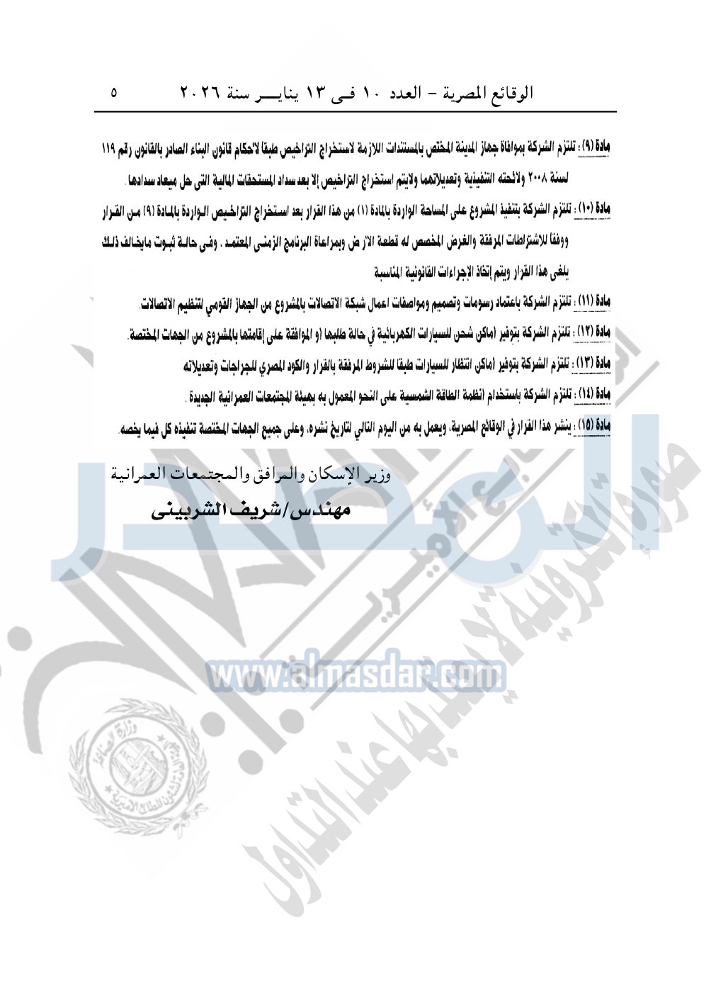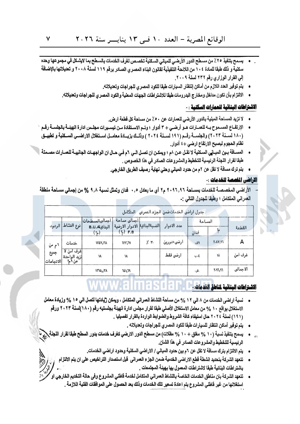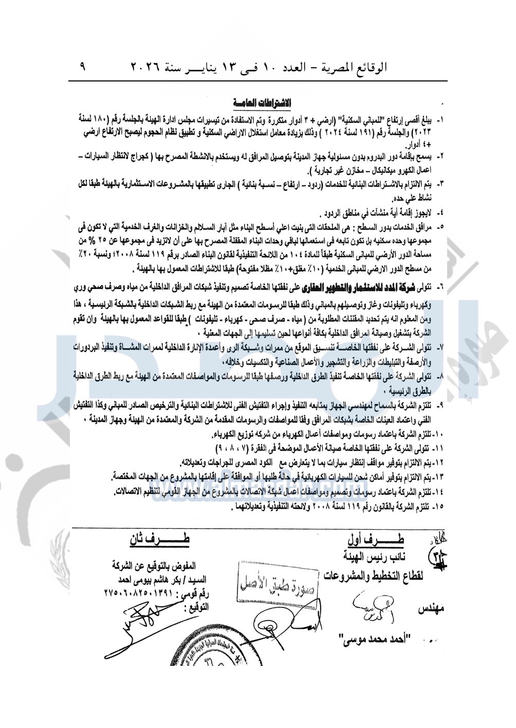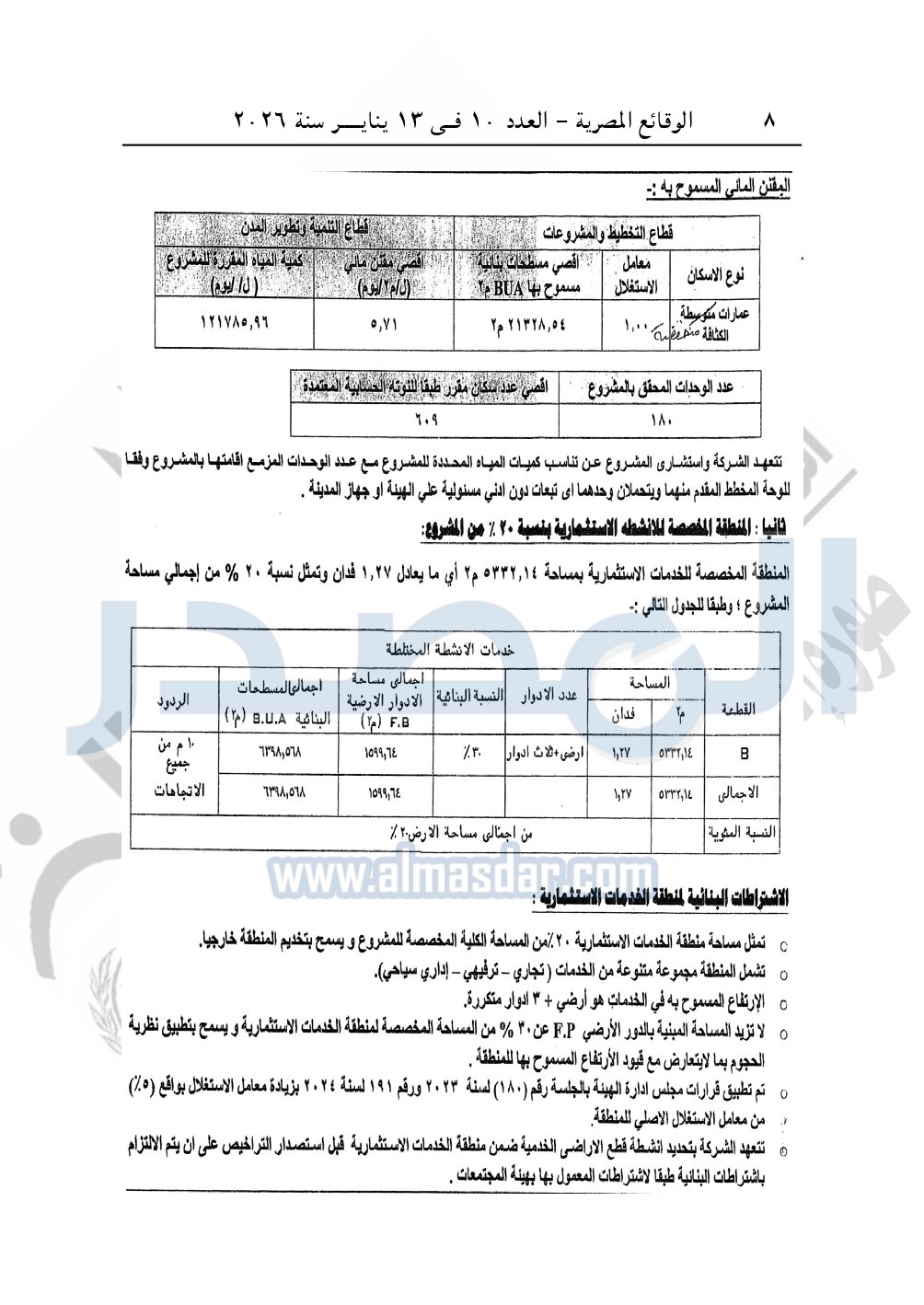 نشرت الوقائع المصرية، في العدد 10، الصادر في 13 يناير سنة 2026، قرار وزارة الإسكان والمرافق والمجتمعات العمرانية، رقم 762 لسنة 2025، بتاريخ 30-6-2025، بشأن اعتماد تخطيط وتقسيم قطعة أرض بمساحة 26660.68م2 بما يعادل 6.35 فدان الكائنة بمنطقة "350" فدان - بالحى السياحي بمدينة أسوان الجديدة المخصصة لشركة المدد للاستثمار والتطوير العقاري لإقامة مشروع عمراني مختلط "80% عمرانی متكامل و20% أنشطة استثمارية".