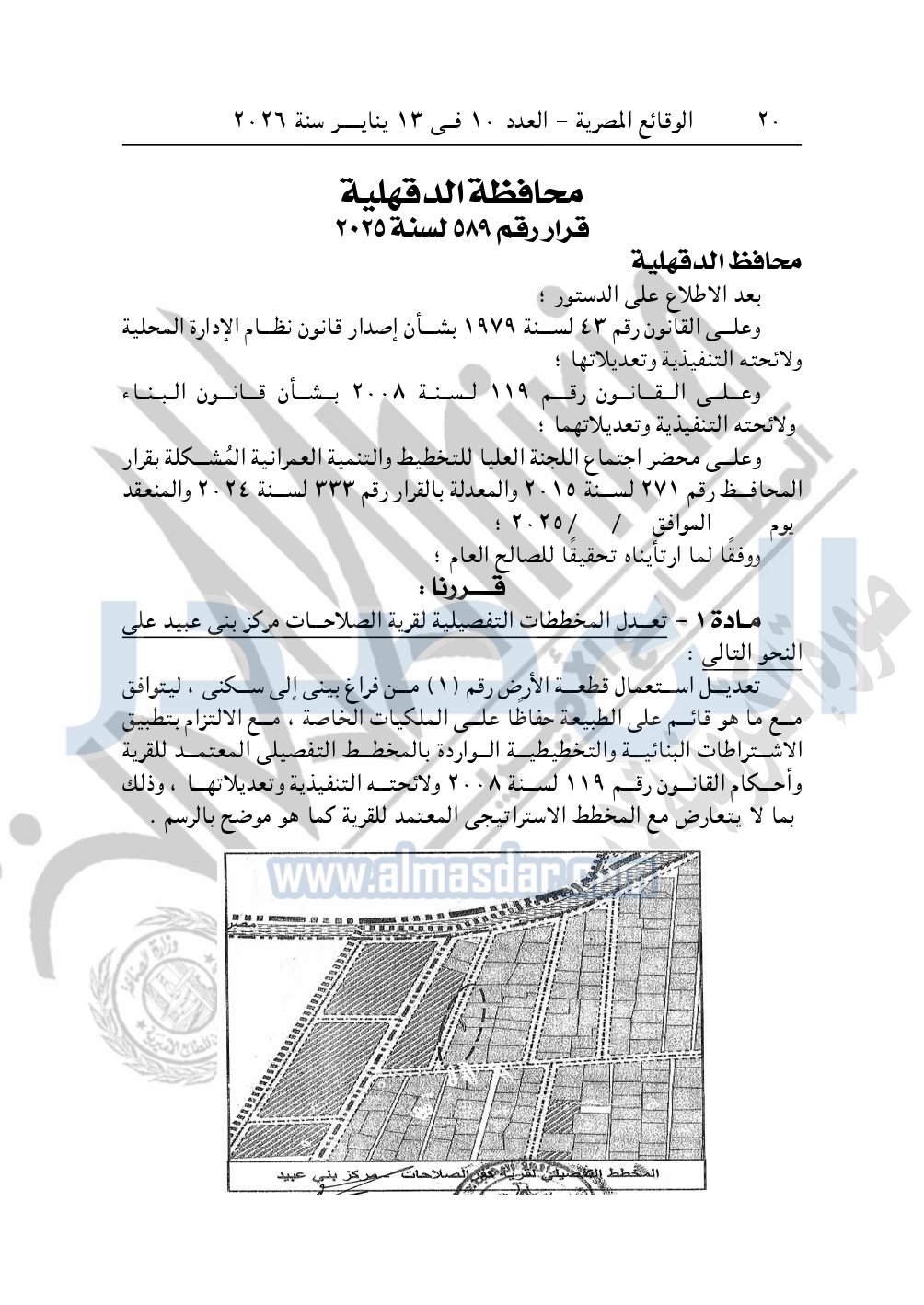 نشرت الوقائع المصرية، في العدد 10، الصادر في 13 يناير سنة 2026، قرار محافظة الدقهلية، قرار رقم 589 لسنة 2025، بشأن تعديل المخططات التفصيلية لقرية الصلاحات.