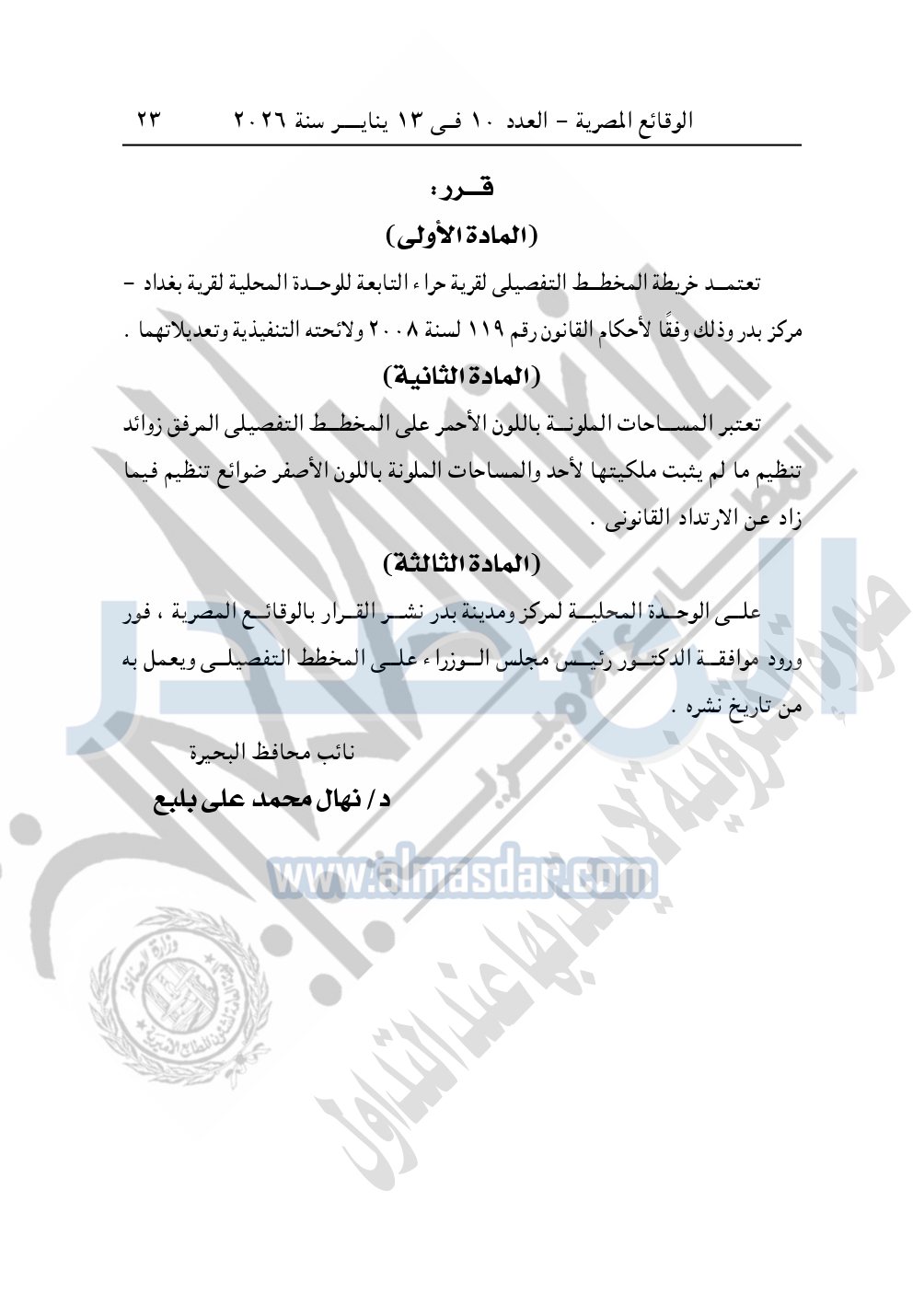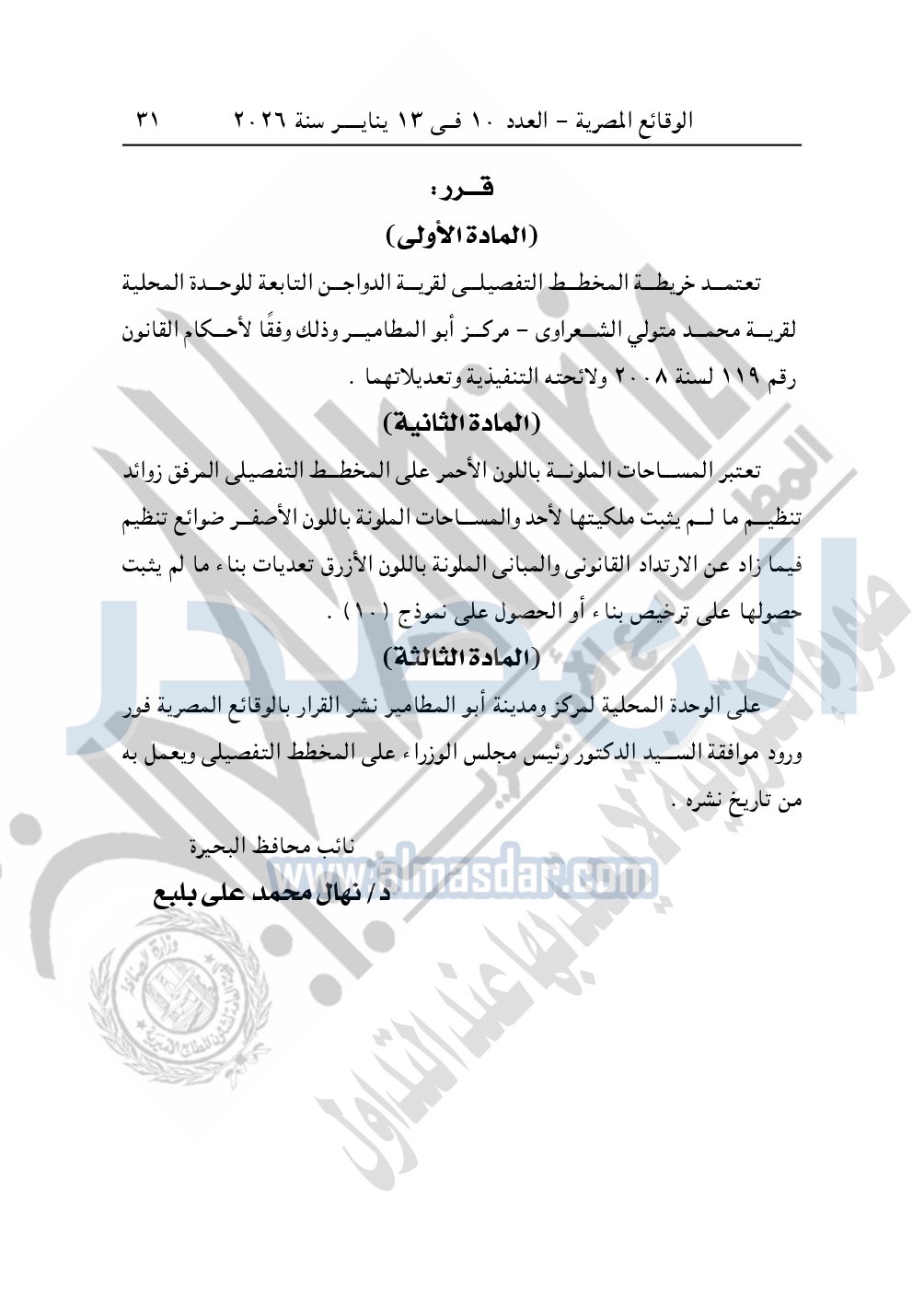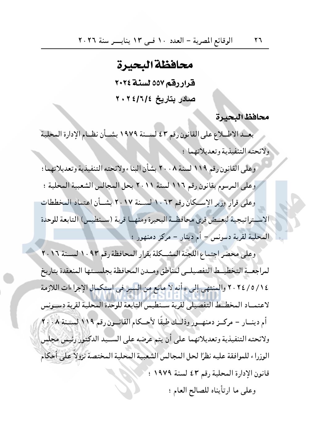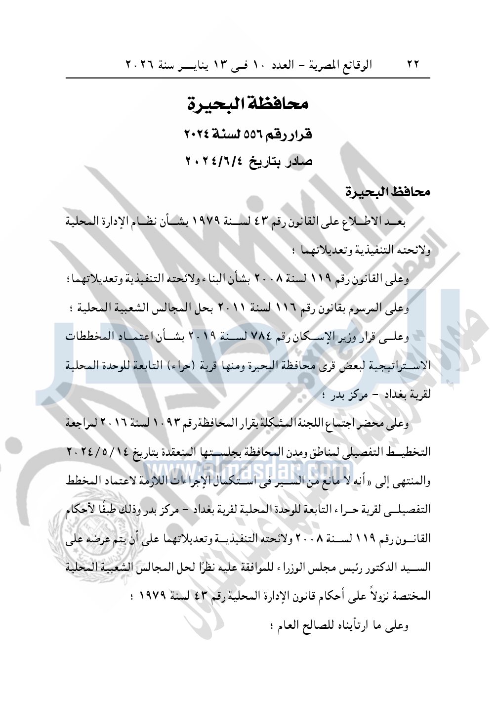 كما نشرت الوقائع المصرية، في العدد 10، الصادر في 13 يناير سنة 2026، قرار محافظة البحيرة، قرار رقم 556 لسنة 2024، بتاريخ 4-6-2024، بشأن إعتماد المخطط التفصيلي لقرية حراء.