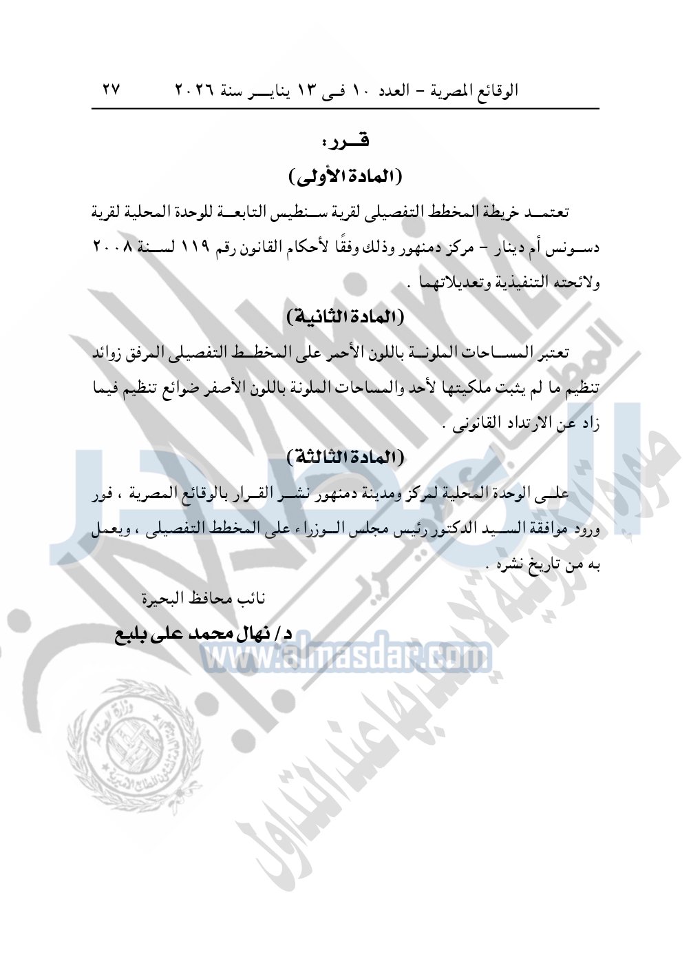 وأيضا نشرت الوقائع المصرية، في العدد 10، الصادر في 13 يناير سنة 2026، قرار محافظة البحيرة، قرار رقم 557 لسنة 2024، بتاريخ 4-6-2024، بشأن إعتماد المخطط التفصيلي لقرية سنطيس.