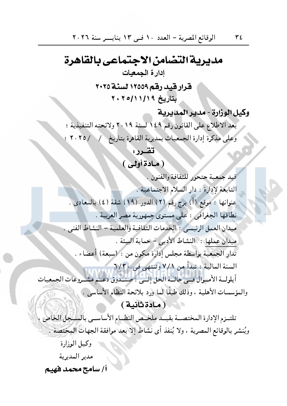 نشرت الوقائع المصرية في العدد 10، الصادر في 13 يناير 2026، قرار مديرية التضامن الاجتماعي بالقاهرة، قيد رقم 12559 لسنة 2025، بتاريخ 19-11-2025، بشأن قيد جمعية حتحور للثقافة والفنون.