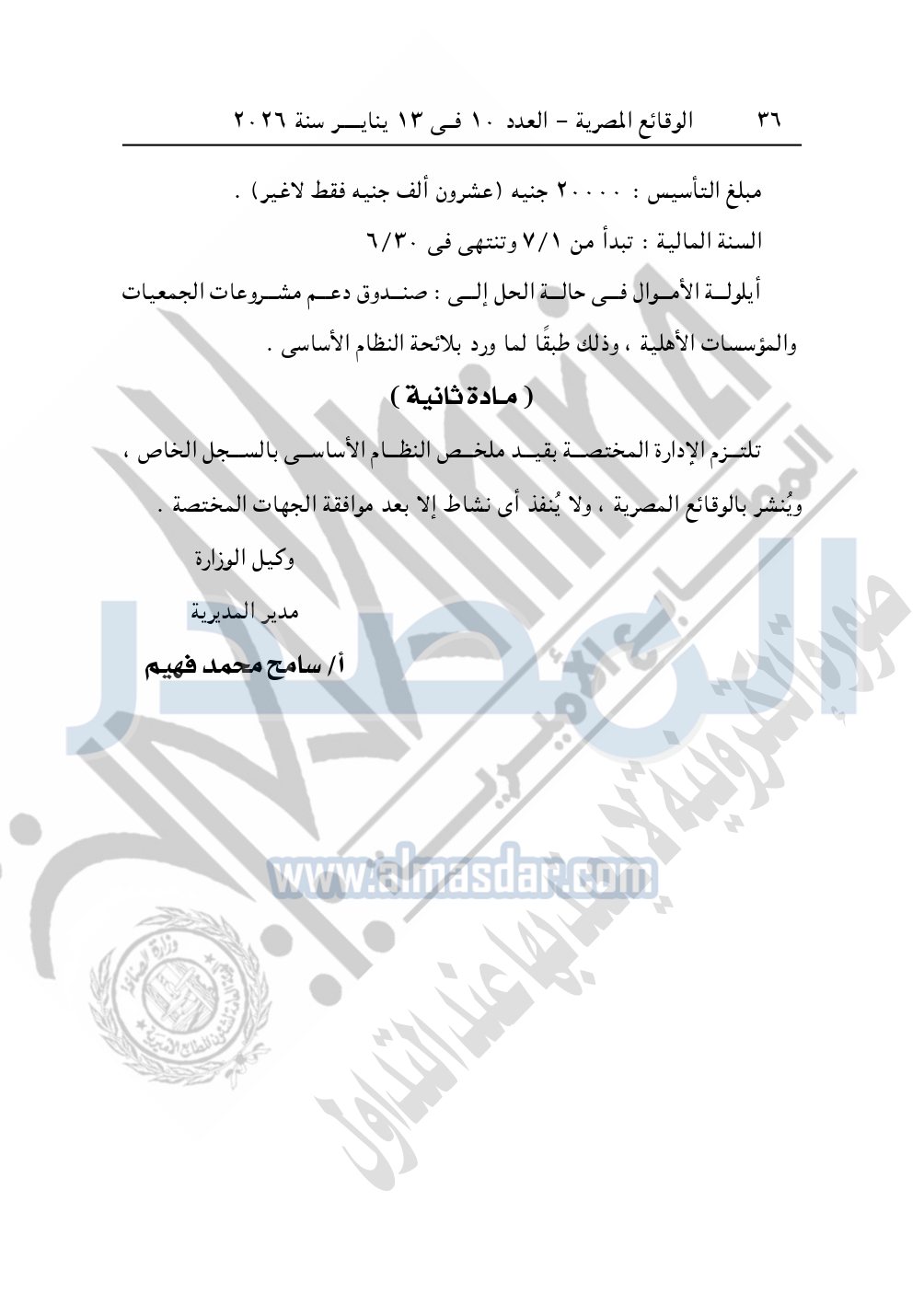 كما نشرت الوقائع المصرية في العدد 10، الصادر في 13 يناير 2026، قرار مديرية التضامن الاجتماعي بالقاهرة، قيد رقم 12561 لسنة 2025، بتاريخ 19-11-2025، بشأن قيد مؤسسة صلاح لتنمية وتطوير المجتمع.