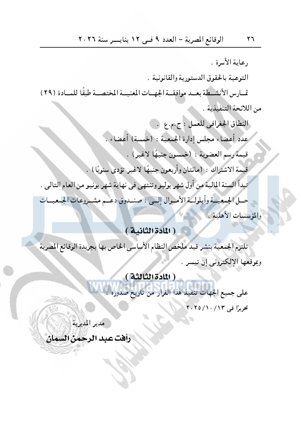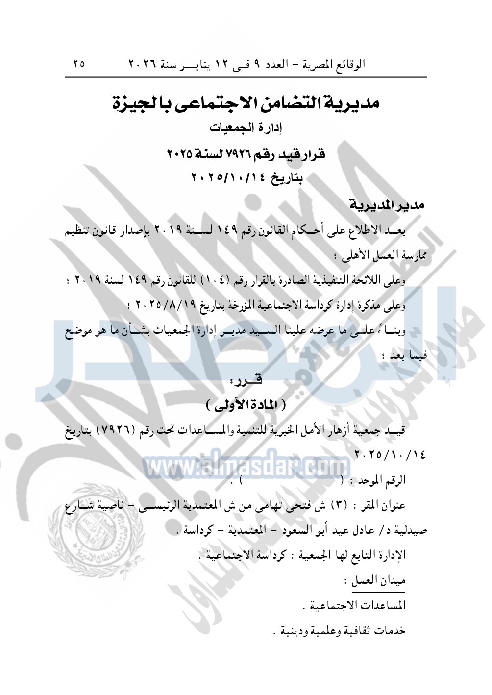 وأيضا نشرت الوقائع المصرية في العدد 9، الصادر في 12 يناير 2026، قرار مديرية التضامن الاجتماعي بالجيزة، قيد رقم 7926 لسنة 2025، بتاريخ 14-10-2025، بشأن قيد جمعية أزهار الأمل الخيرية للتنمية والمساعدات.