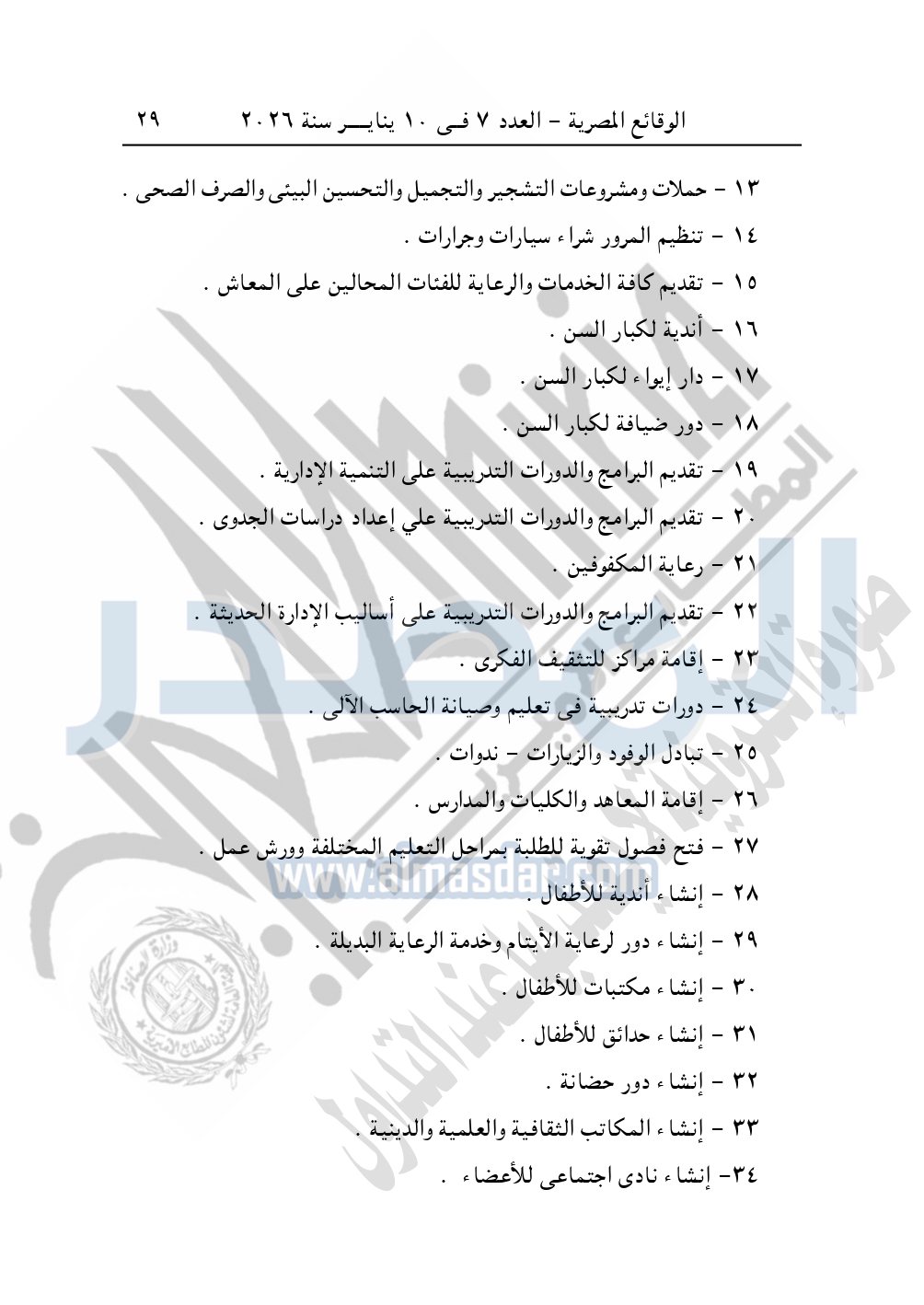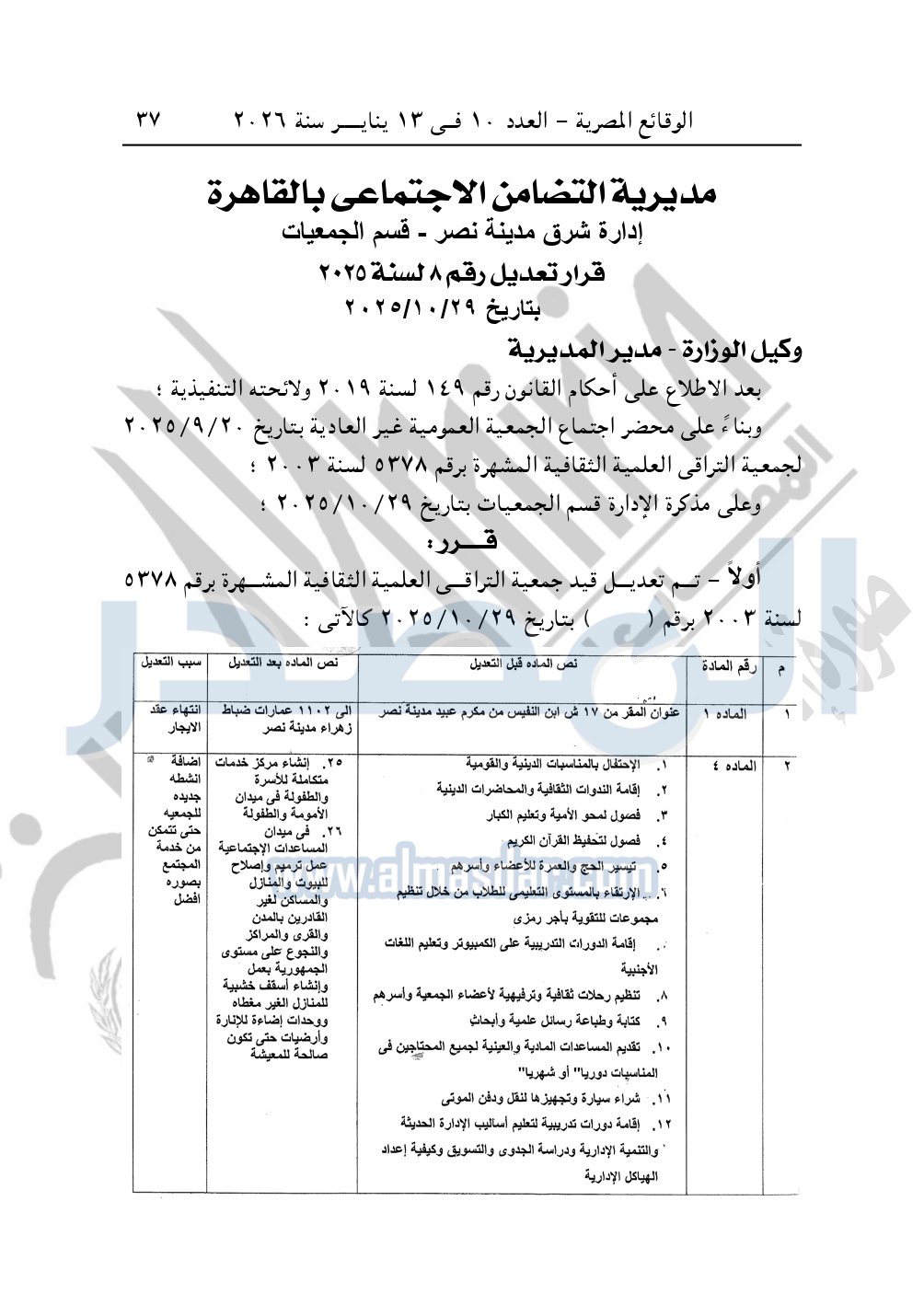 نشرت الوقائع المصرية، في العدد 10، بتاريخ 13 يناير 2026، قرار مديرية التضامن الاجتماعي بالقاهرة، تعديل قيد رقم 8 لسنة 2025، بتاريخ 29-10-2025، بشأن تعديل قيد جمعية التراقى العلمية الثقافية.