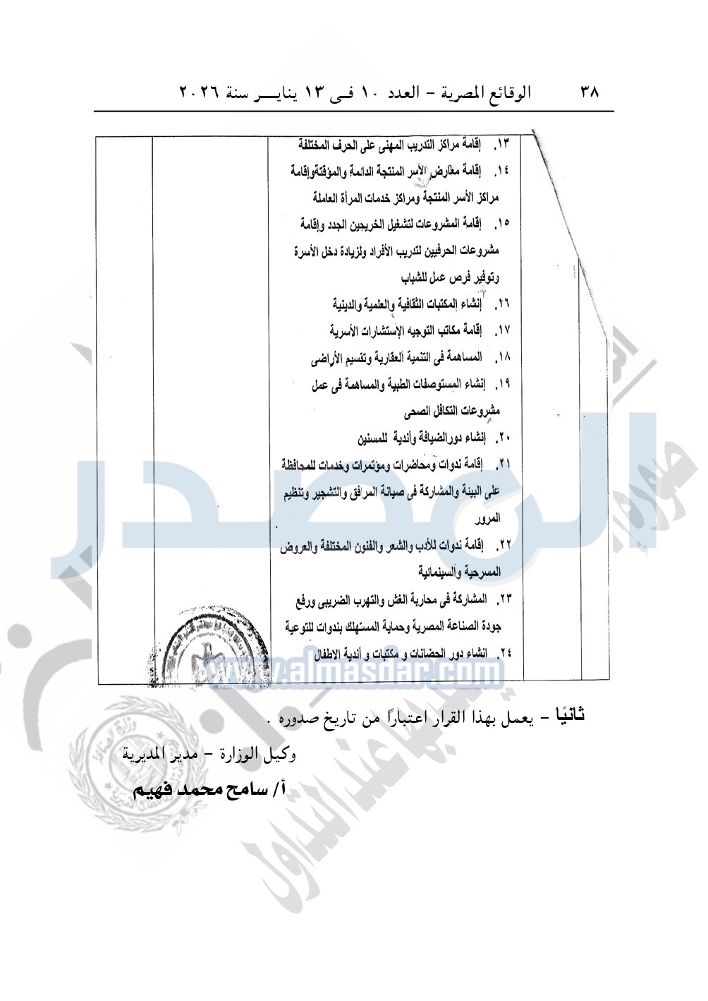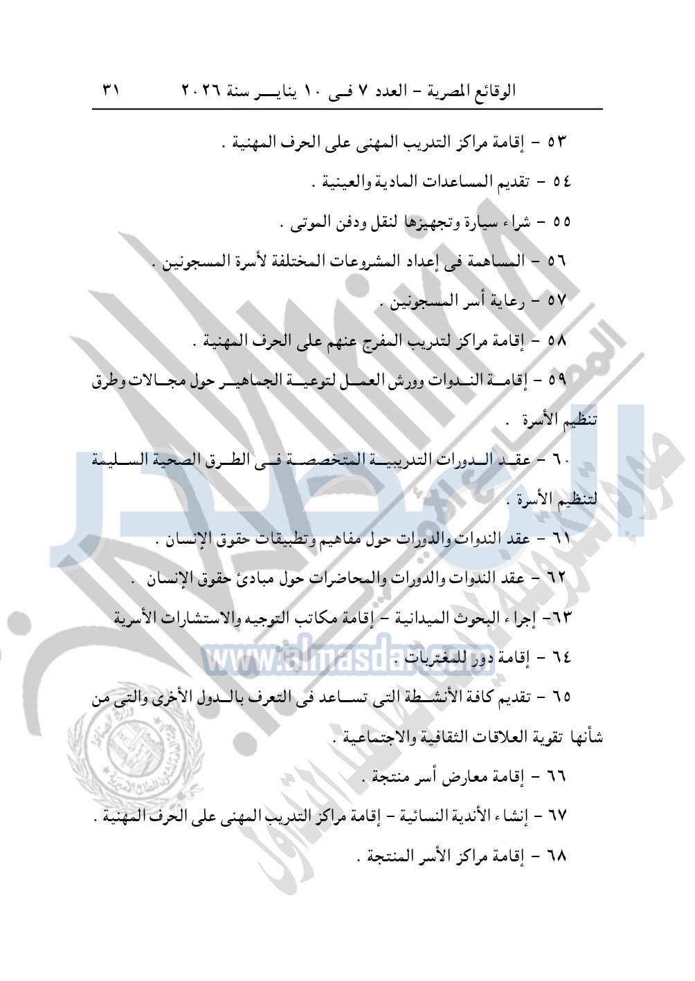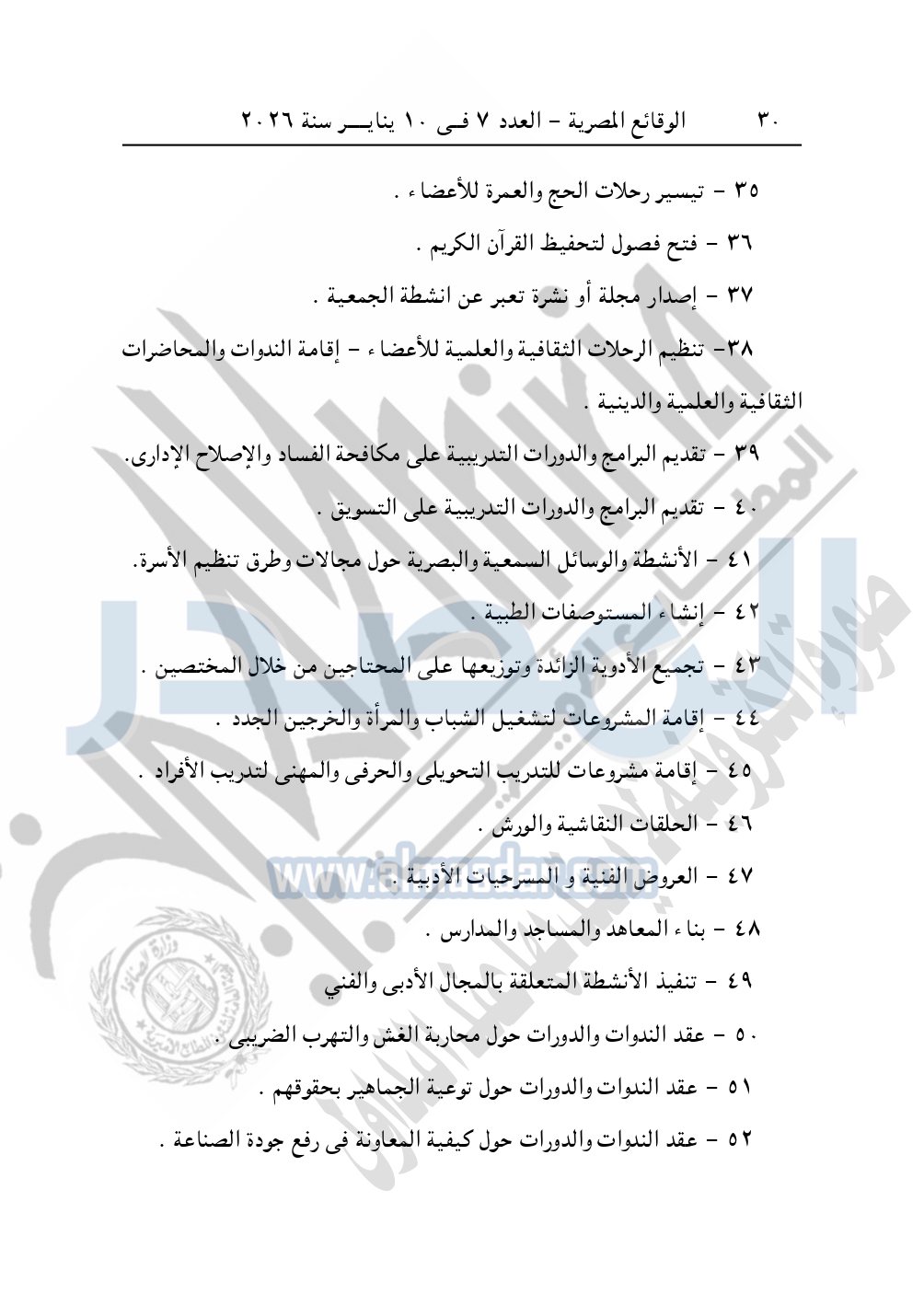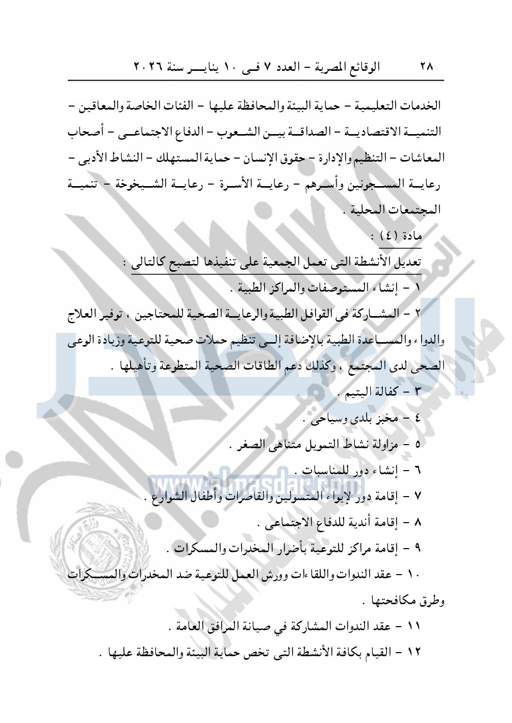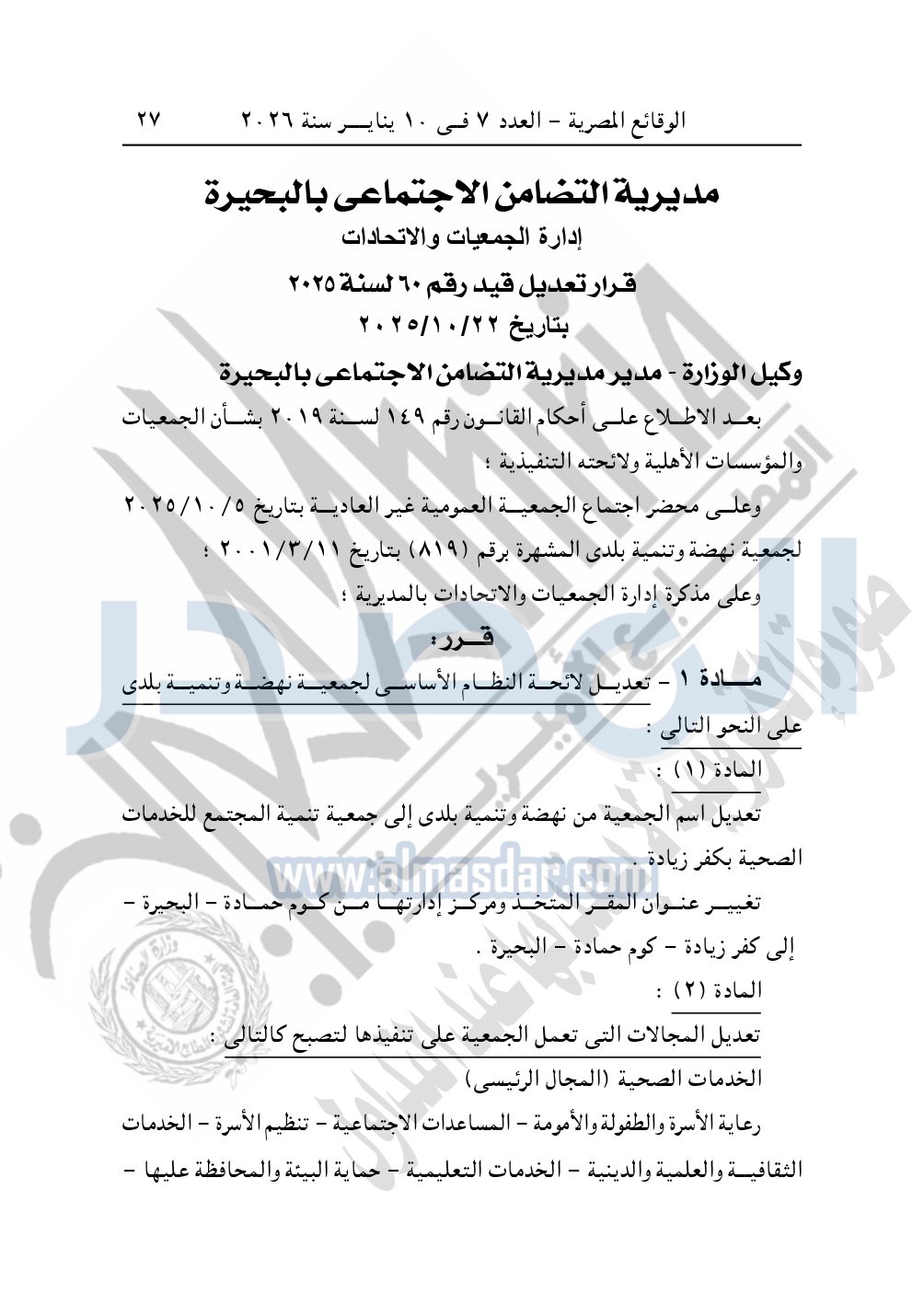 كما نشرت الوقائع المصرية، في العدد 7، بتاريخ 10 يناير 2026، قرار مديرية التضامن الاجتماعي بالبحيرة، تعديل قيد رقم 60 لسنة 2025، بتاريخ 22-10-2025، بشأن تعديل قيد جمعية نهضة وتنمية بلدي.